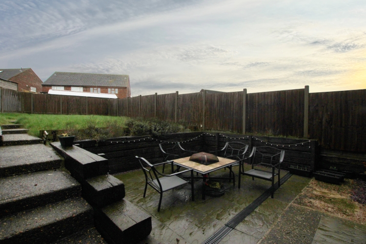 Rear garden with fenced surrounds, sizeable patio area and lawned area with brick built outbuilding, access via side gate to front, lawned and patio slab frontage giving driveway space for at least 2 vehicles