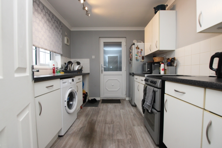 A range of modern wall and base units, tiled surrounds to work surface incorporating a sink with drainer, integrated oven and 4-ring hob, integrated extractor hood, space for range of appliances, double glazed window to front aspect, double glazed door onto side aspect