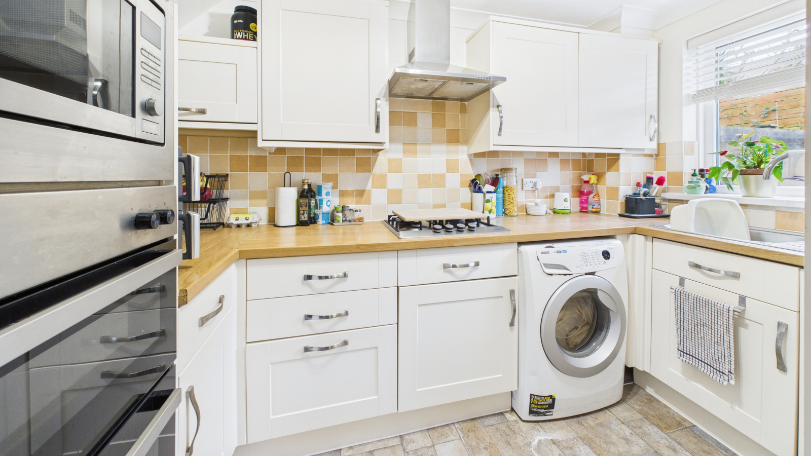 UPVC double glazed window to rear, base and wall mounted cupboards with roll top worksurfaces and complementary tiling over, stainless steel sink unit, gas hob with extractor fan over, space for washing machine, integral fridge/freezer, electric oven and microwave.