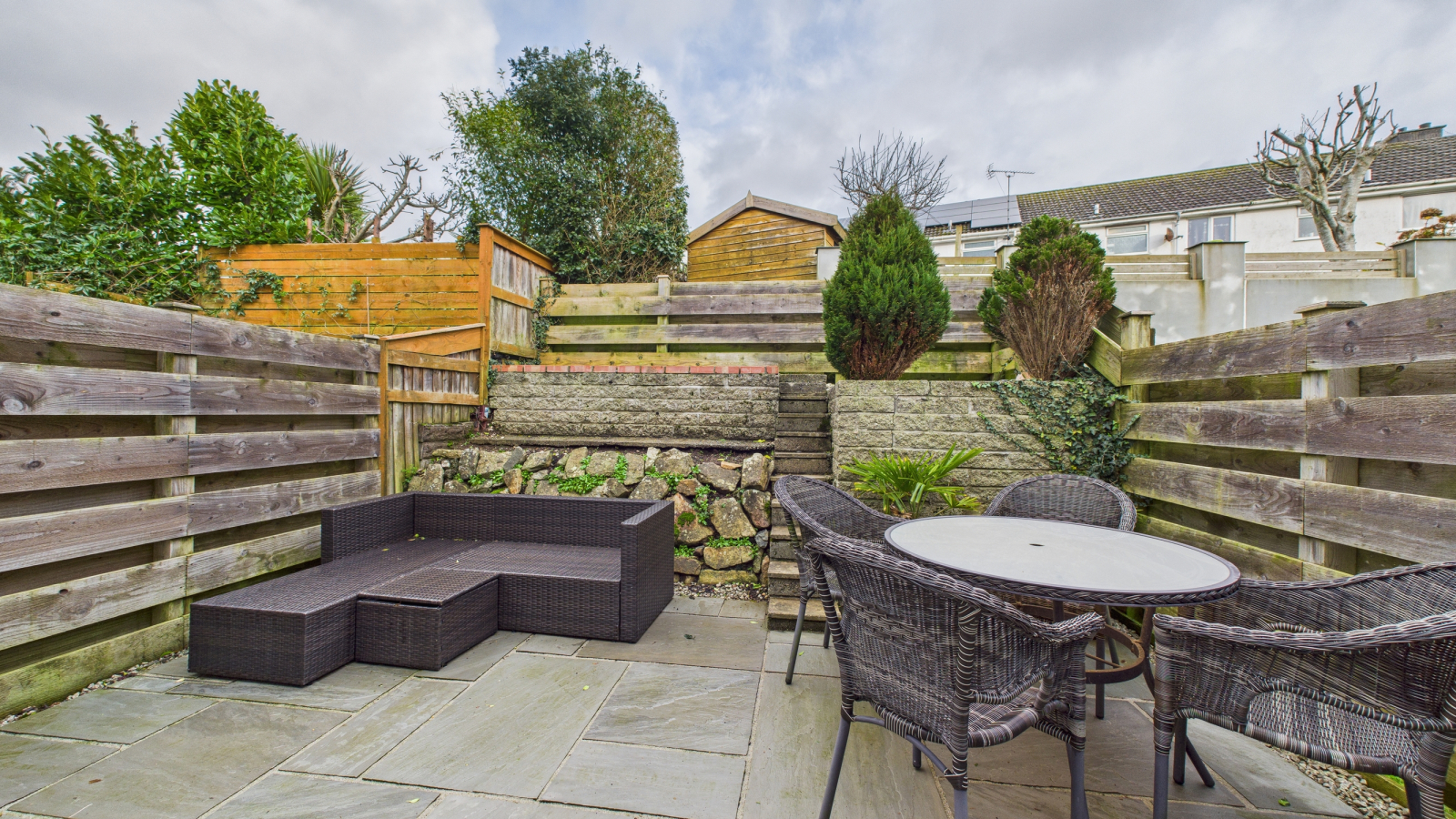 Pathway from the parking leads to the front of the property with a small gravelled front garden. The rear is fully enclosed patio, paved courtyard garden with surrounding timber fencing along with tiered gravelled seating area, outside tap. Garage and parking area can be found to the approach of the property and is jointly owned by the residents of Farmers Court. This area is run by the Farmers Court Management Company.