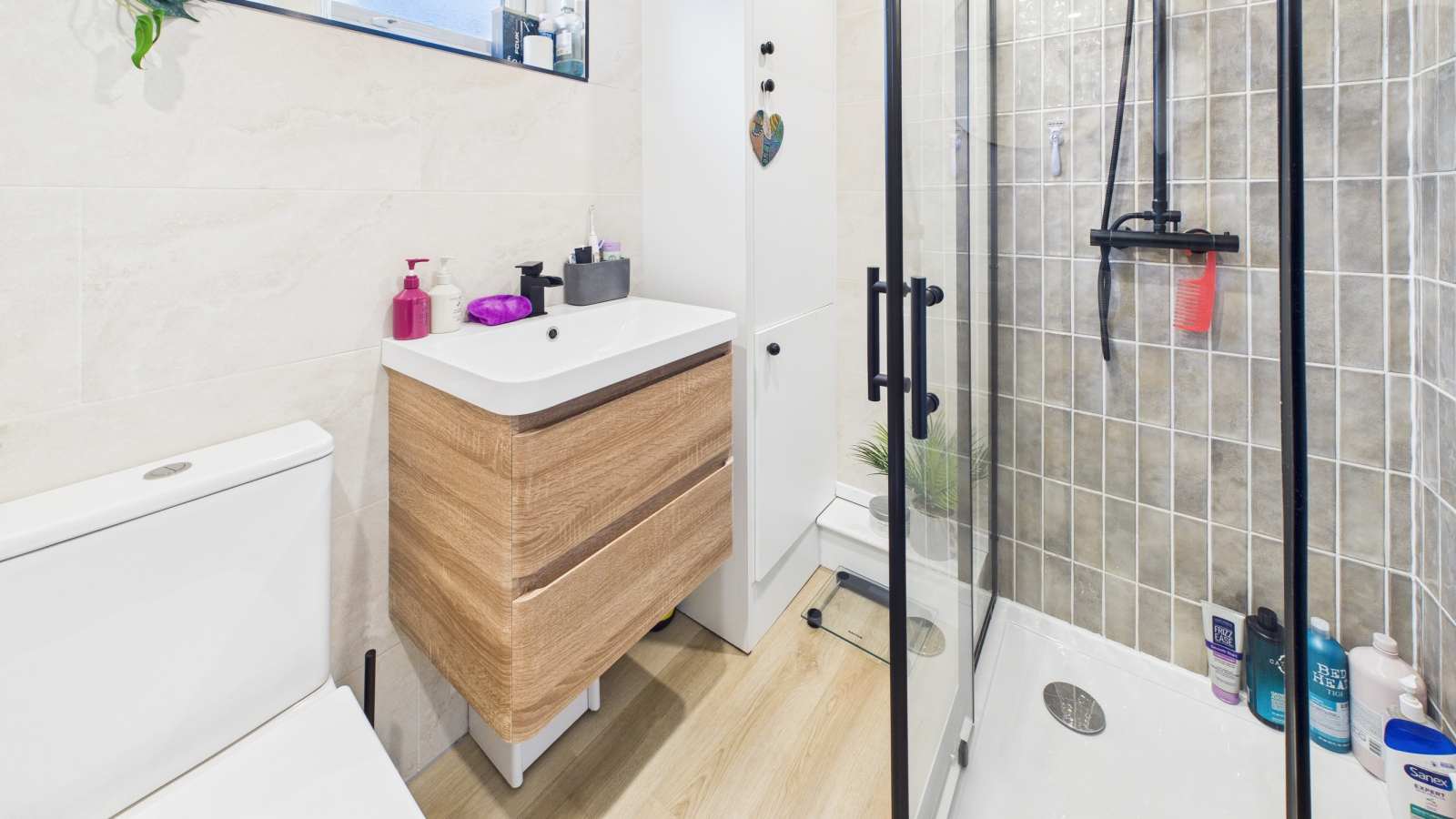 Obscure double glazed window to rear, double shower cubicle with mains fed shower, tiled surround, vanity mounted wash hand basin, WC, cupboard housing gas combination boiler, wall mounted heated towel rail.
