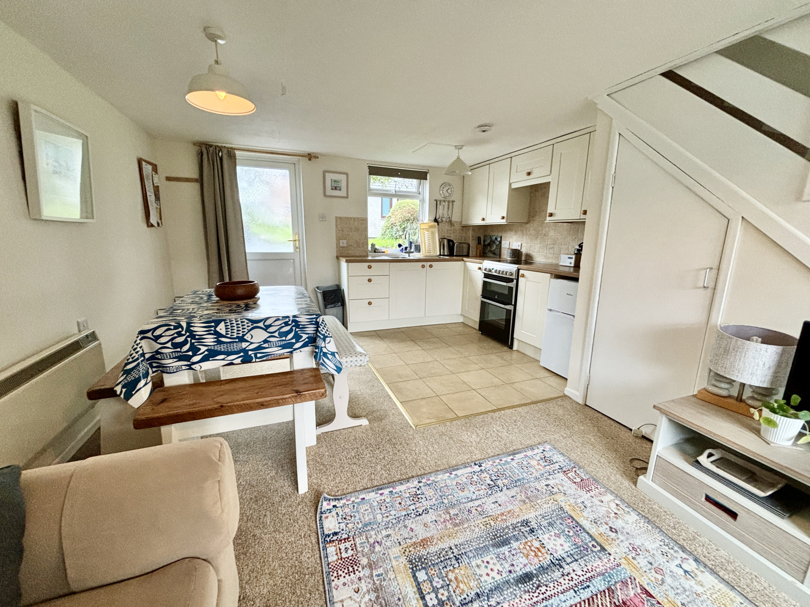 Double glazed window to front and rear with further double glazed door onto the patio, stairs rising with cupboard under, electric panel heater, base and wall units with worksurface and tiling over, single drainer stainless steel sink unit.