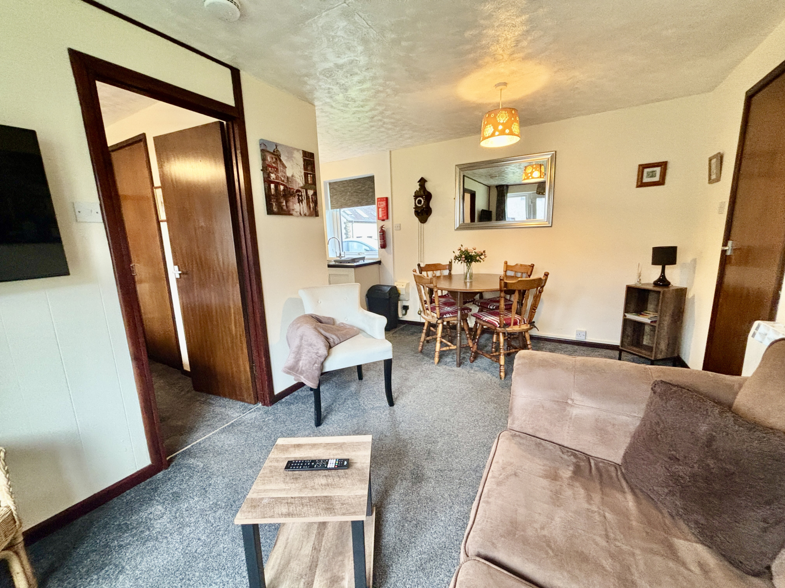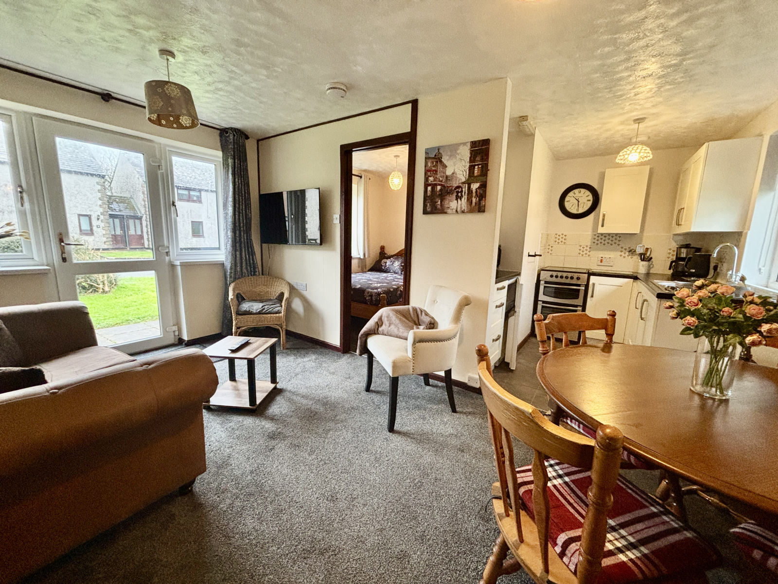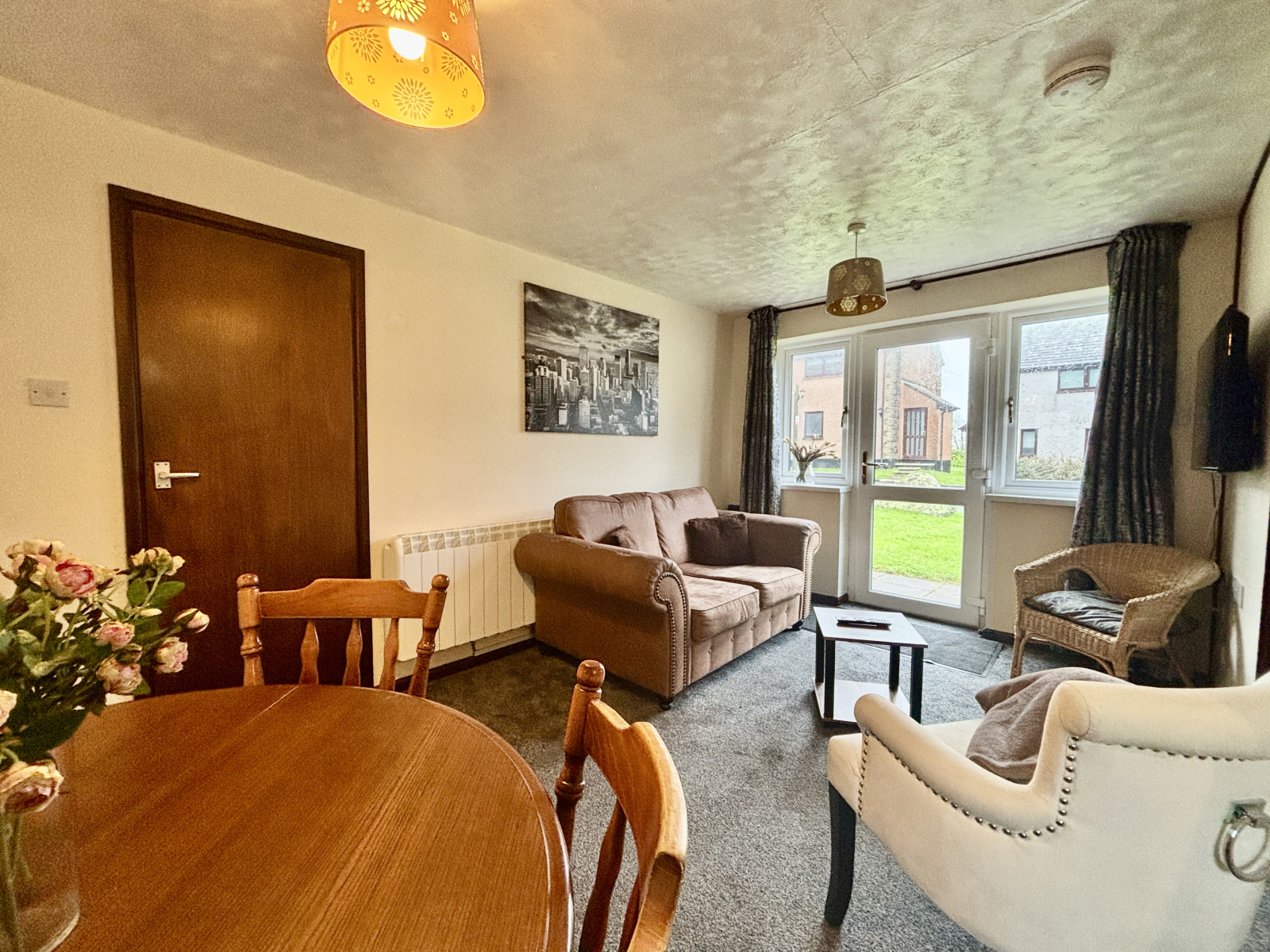 TV point, electric heater, double glazed door and windows onto rear patio.