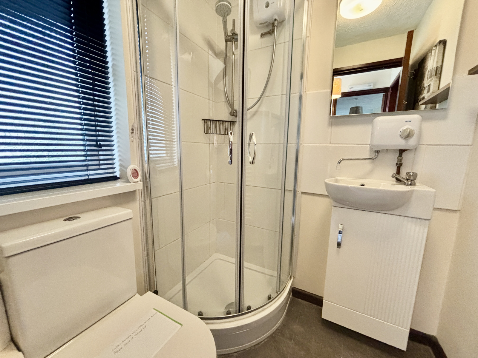 Double glazed window to front, WC, wash hand basin, shaver light and point over, fully tiled shower cubicle, extractor fan, heated towel rail.