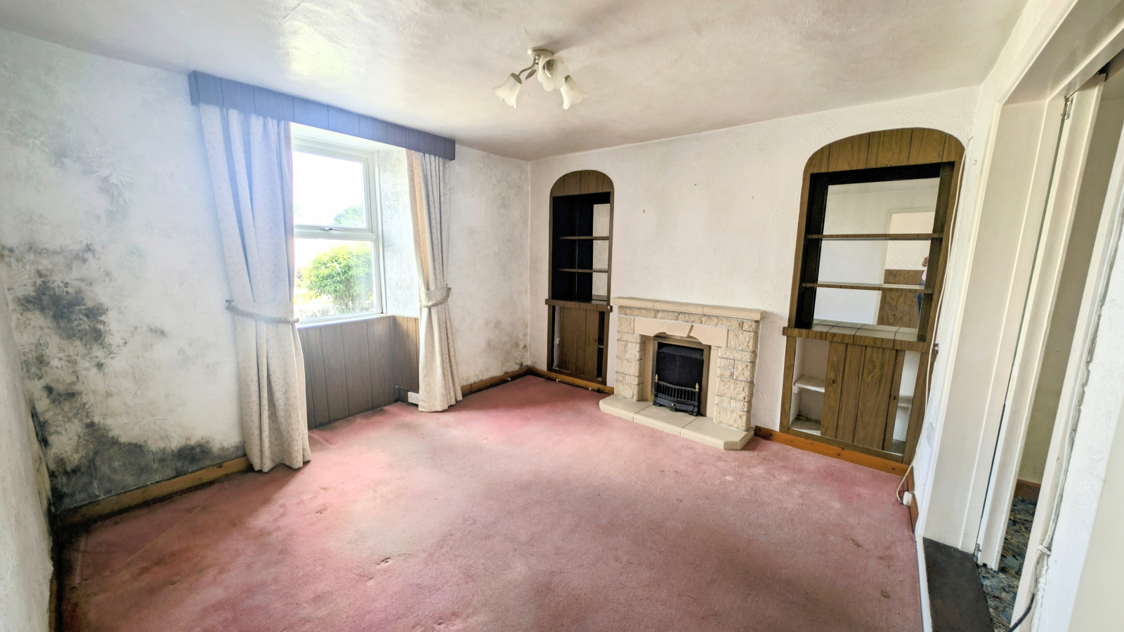 Double glazed window to the front, fireplace (not in use) with stone hearth, surround, mantle and shelved recesses to either side. Sliding doors to: