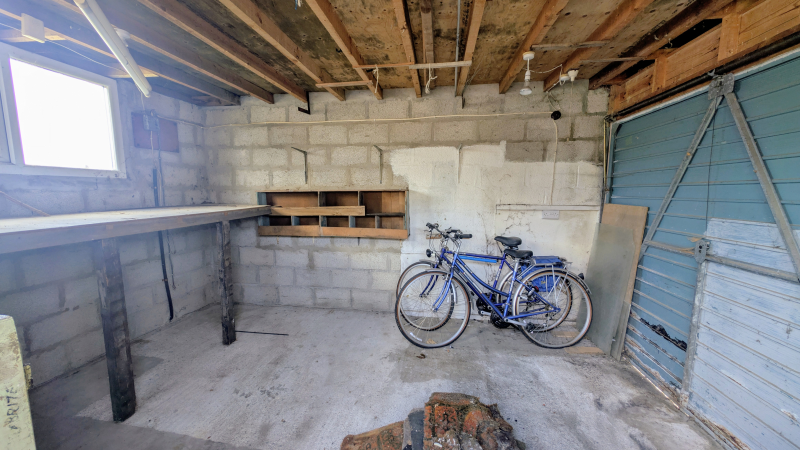 With power and light, metal up and over door, double glazed window to the front and two to the side.