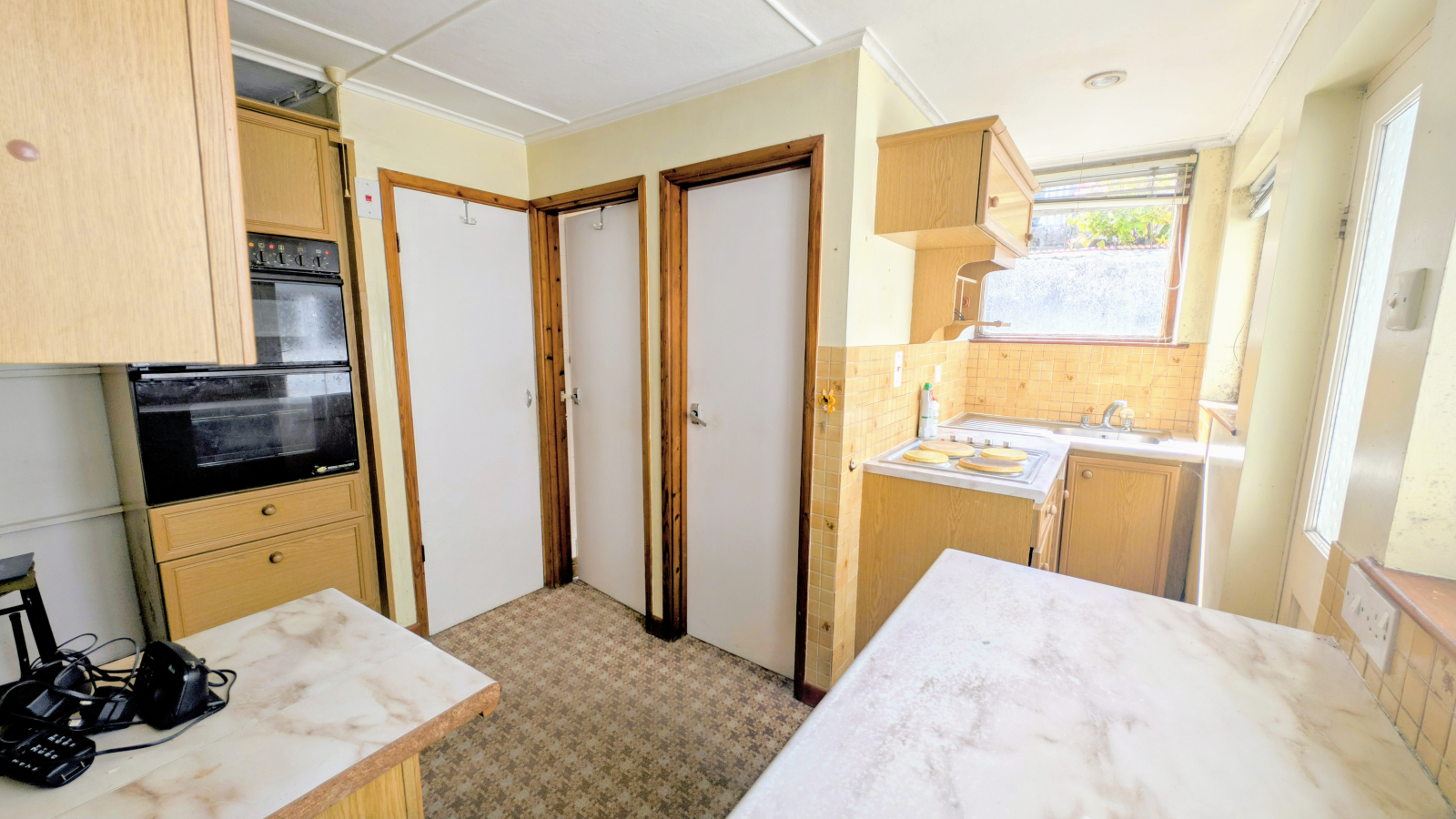 Range of base and wall mounted units, wall mounted twin oven, integrated hob, single bowl stainless steel sink unit with mixer tap and drainer, built in cupboard housing water tank, two single glazed windows and door to the side, single glazed window to the rear.