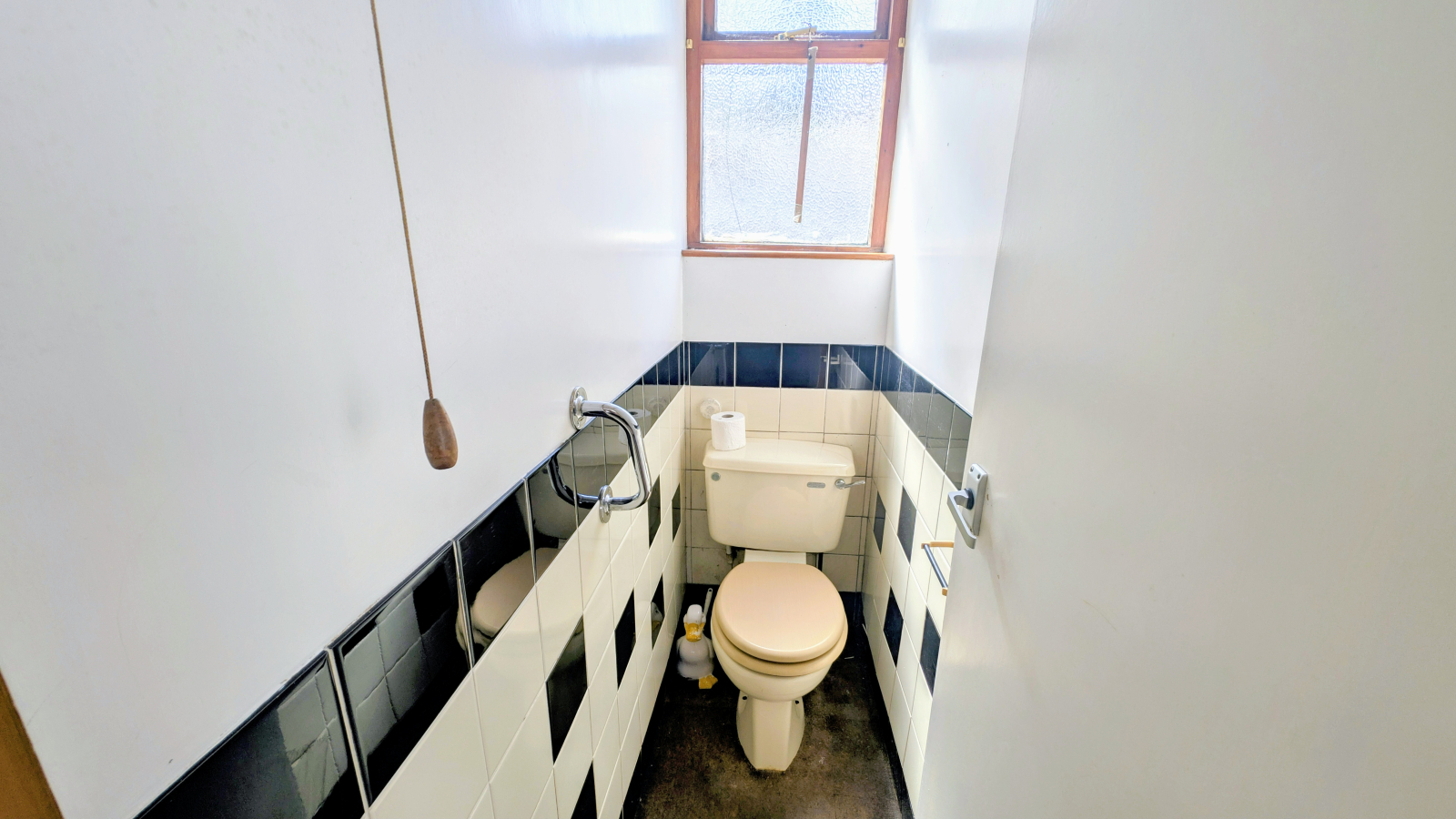 Tiled to dado height, low level w.c., single glazed window to the rear.
