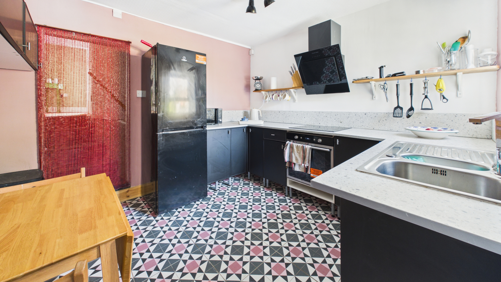 Range of base and wall mounted units, double glazed window to the rear, radiator, electric oven and hob, one and a half bowl stainless steel sink unit with mixer tap and drainer, tiled flooring. Door to: