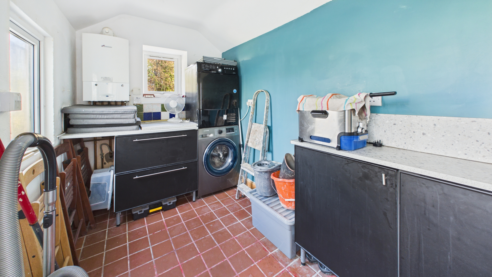 Wall mounted boiler, range of base units, double glazed windows to the side and rear, tiled flooring, door to outside.