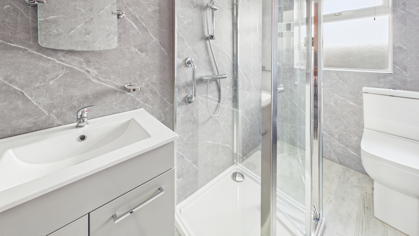 Glazed shower cubicle with mains shower, wash hand basin with storage under, low level w.c., double glazed window to the rear, extractor fan.