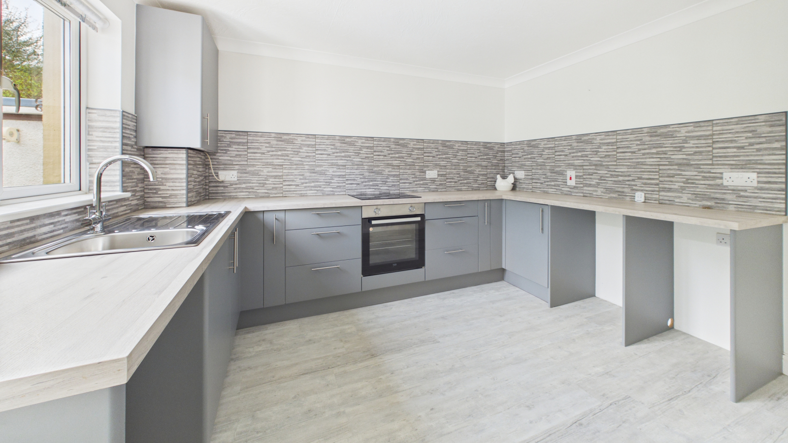 Range of base units with built in electric oven and hob, cupboard housing wall mounted combination boiler, single bowl stainless steel sink unit with mixer tap and drainer, painted pine panelled wall, double glazed window to the rear. Door to: