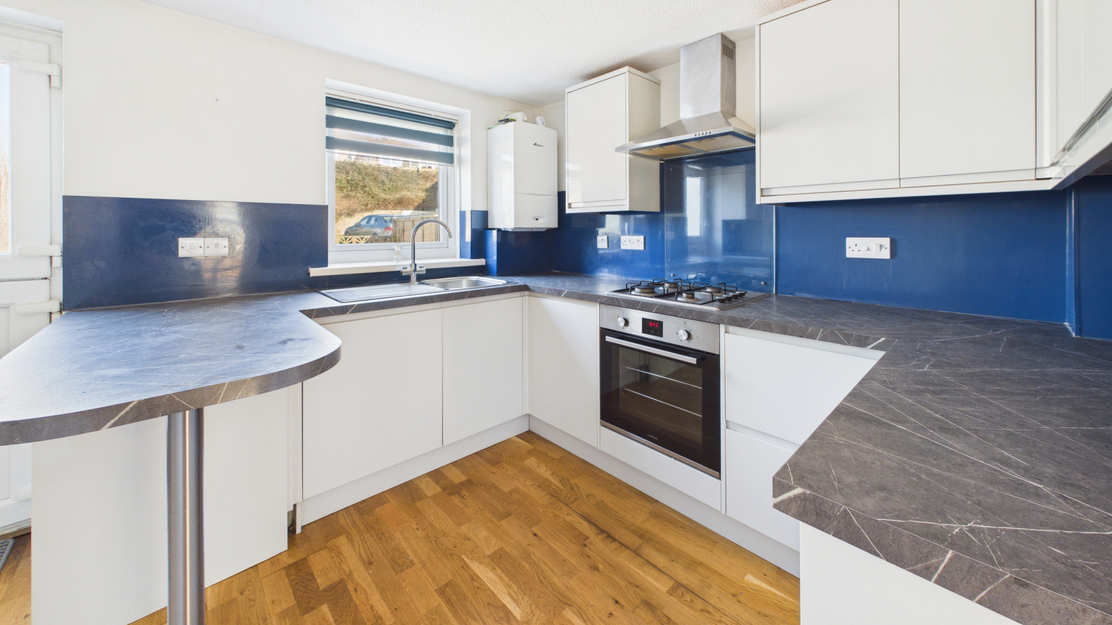 Range of base and wall mounted units, built in fridge/freezer, electric oven, gas hob and extractor hood over, dishwasher, washer/dryer, single bowl stainless steel sink unit with mixer tap and drainer, wall mounted boiler, double glazed window and UPVC stable door to the rear.