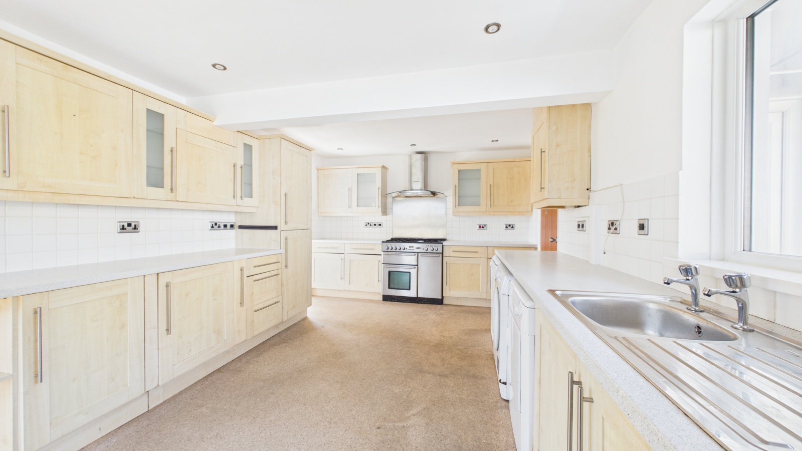 Range of base and wall mounted units, Rangemaster five ring gas oven and hob with extractor hood over, stainless steel single bowl single unit with hot and cold taps and drainer, plumbing for washing machine and dishwasher, built in fridge/freezer, cupboard housing wall mounted gas boiler, doors to outside, hallway and bedroom four, window to the front.