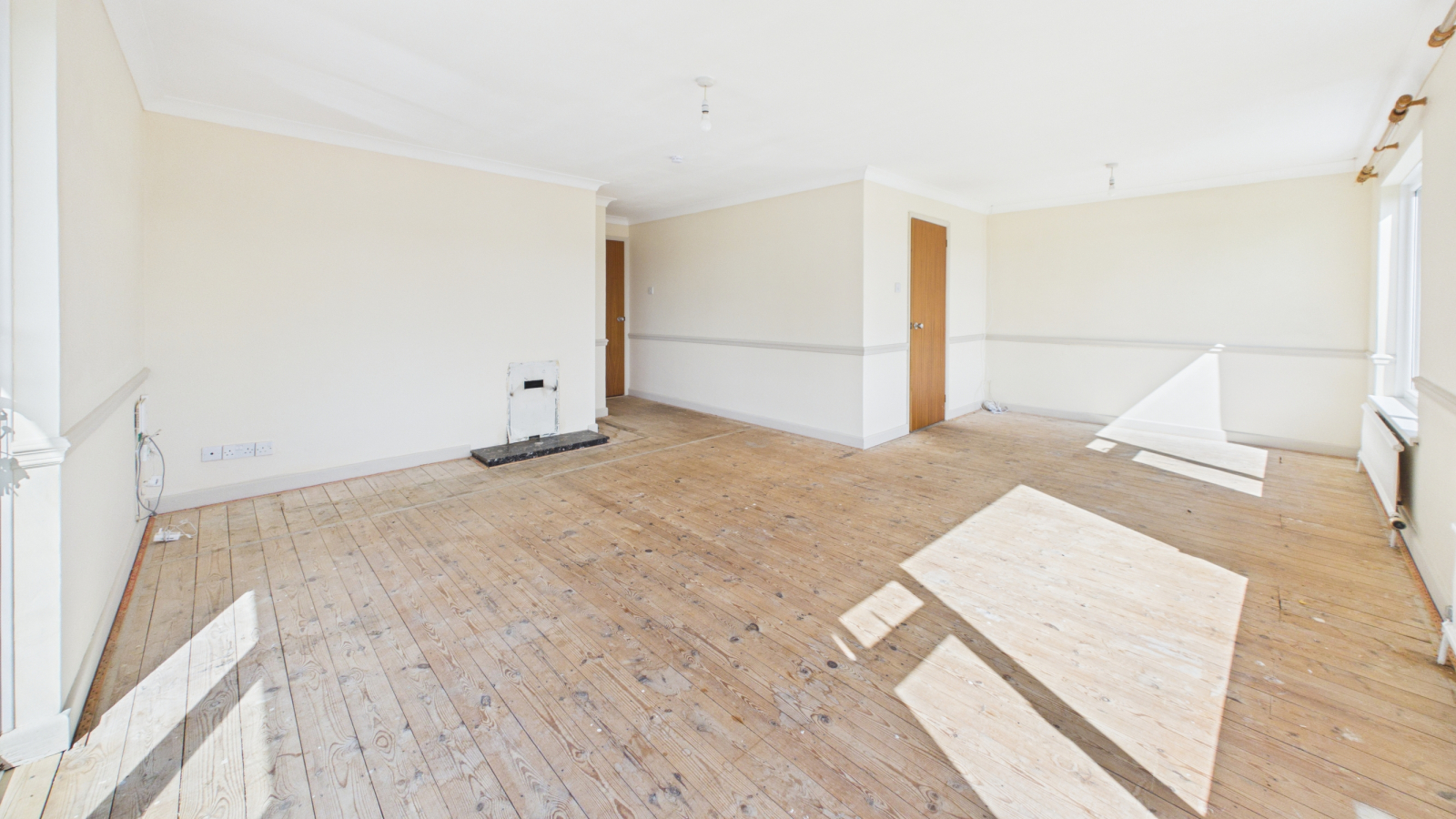 Two double glazed windows to the front with views over Copperhouse Pool, two radiators, double glazed sliding patio doors to the side, stone hearth and recess previously housing the fire (not in use). Door to: