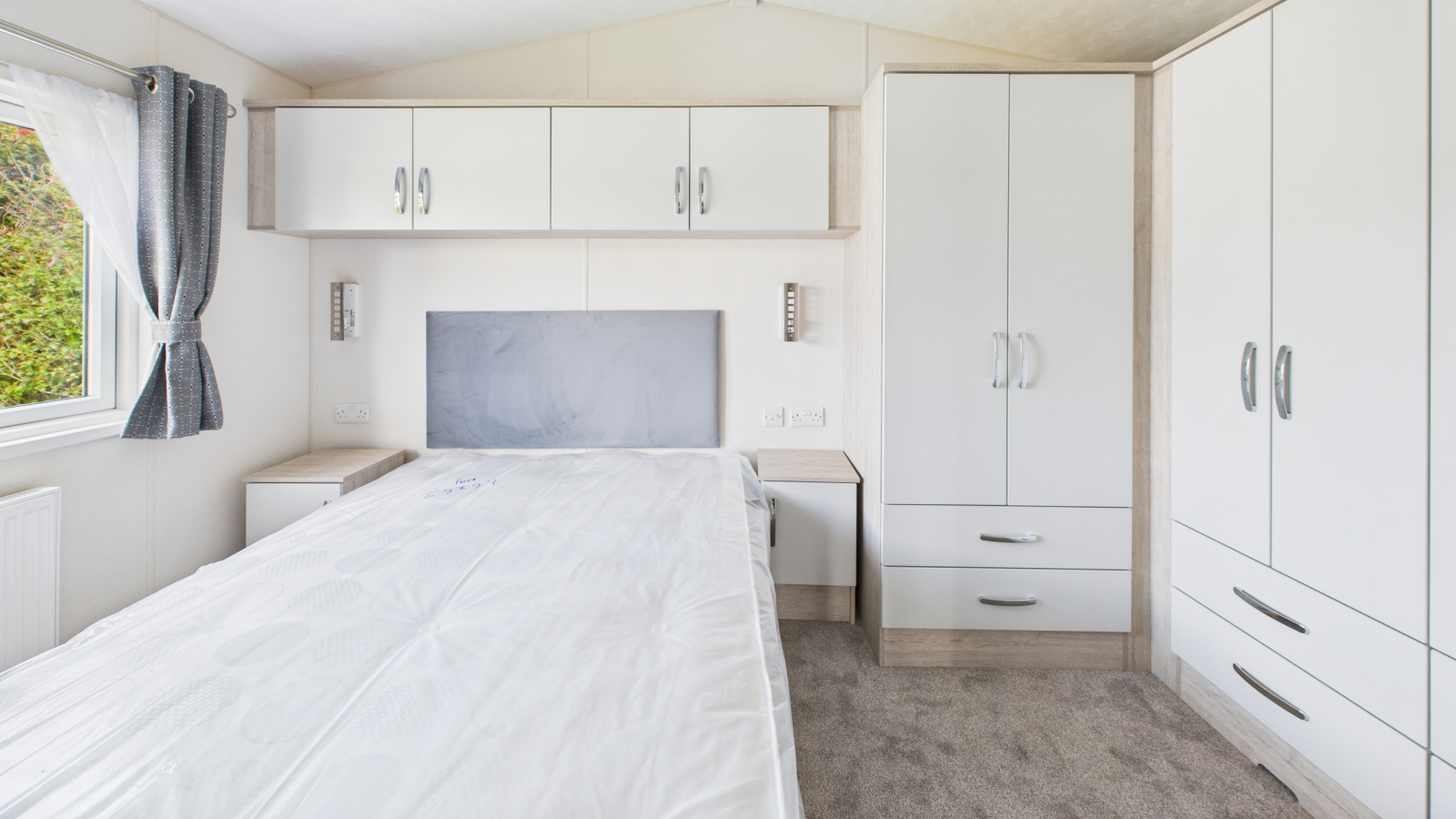 Range of built in wardrobes, double glazed window to the side, wall mounted bedside lamps, radiator.