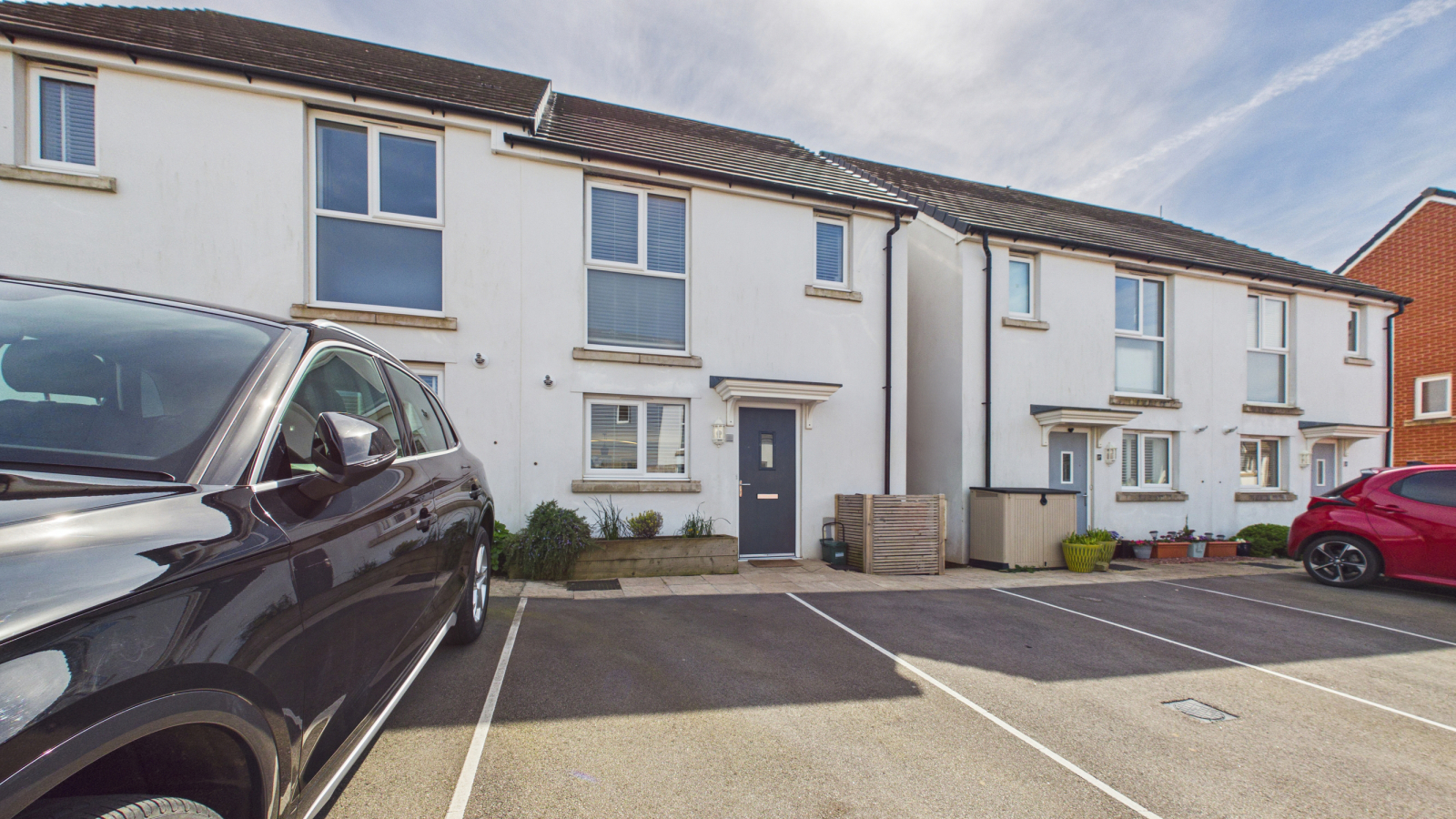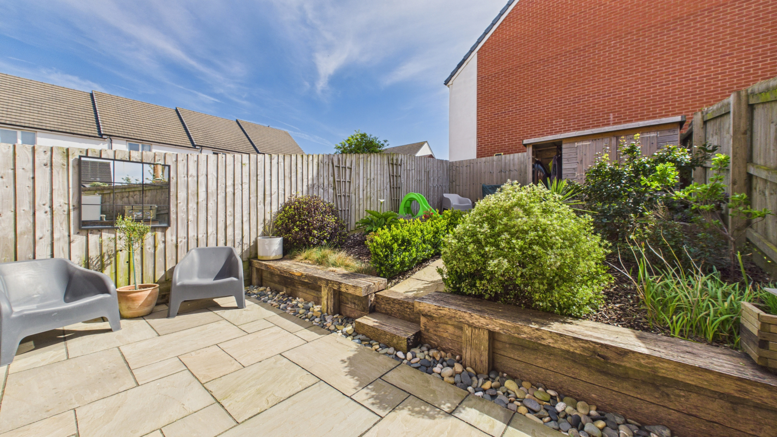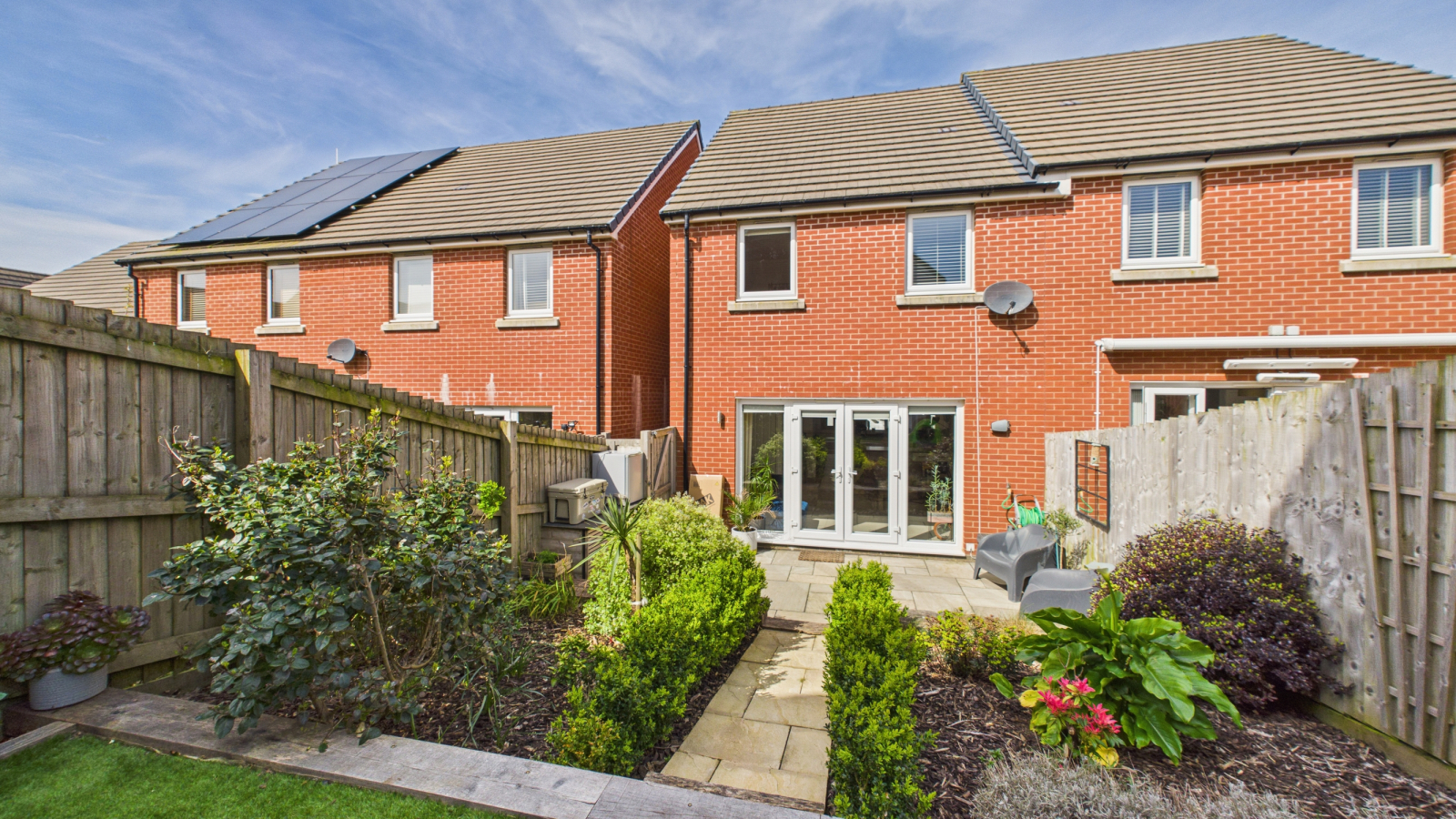 To the rear of the property there is a paved area with steps leading up to an area laid to wood chippings and further area laid to astro-turf with fence boundaries and gated access leading to the front of the property. To the front there are two allocated parking spaces.