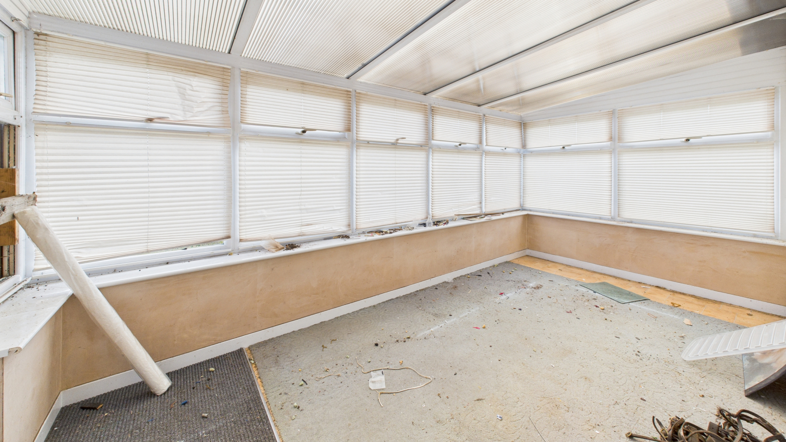 Double glazed to three sides, polycarbonate roof, patio doors to rear garden.