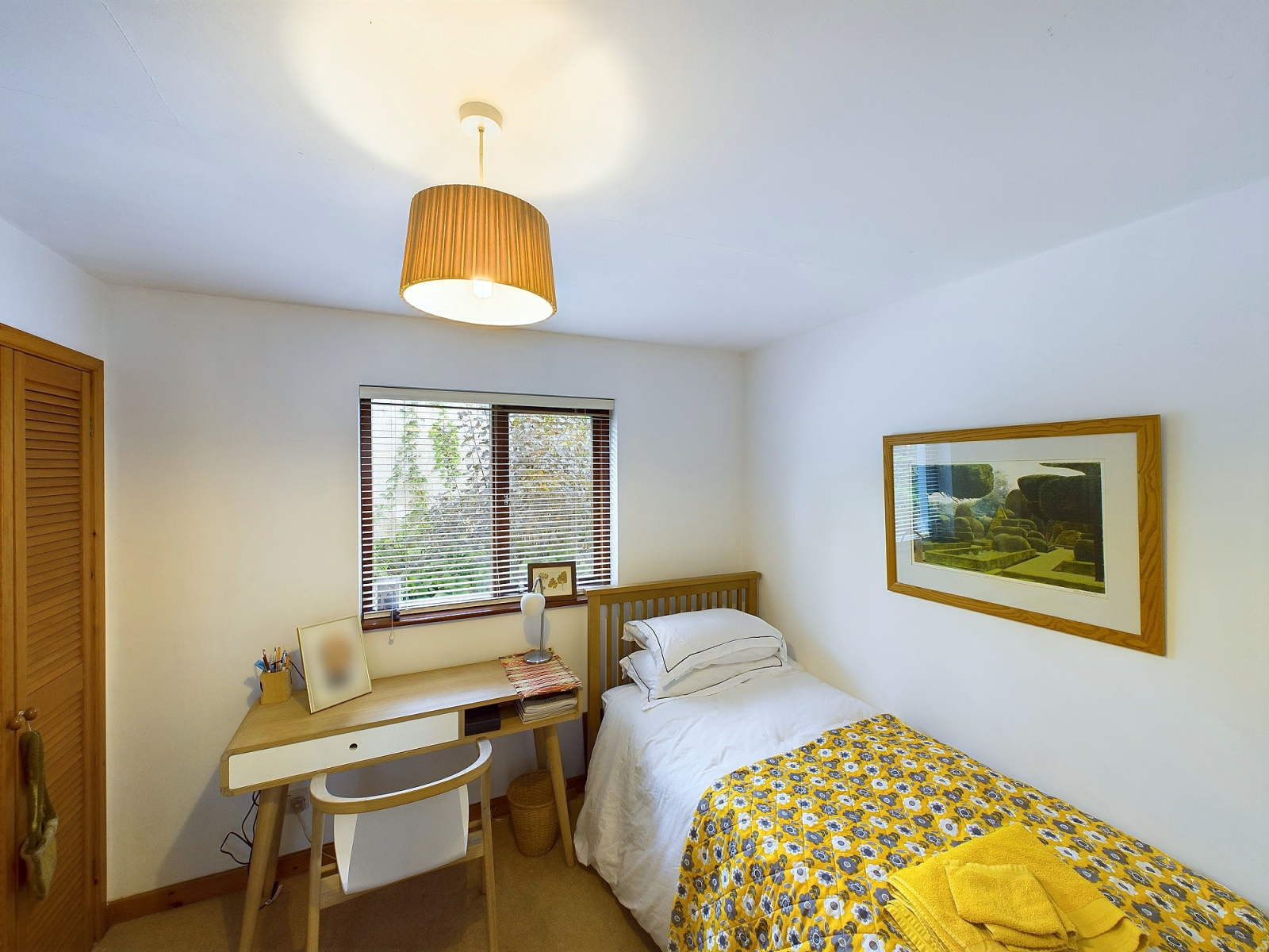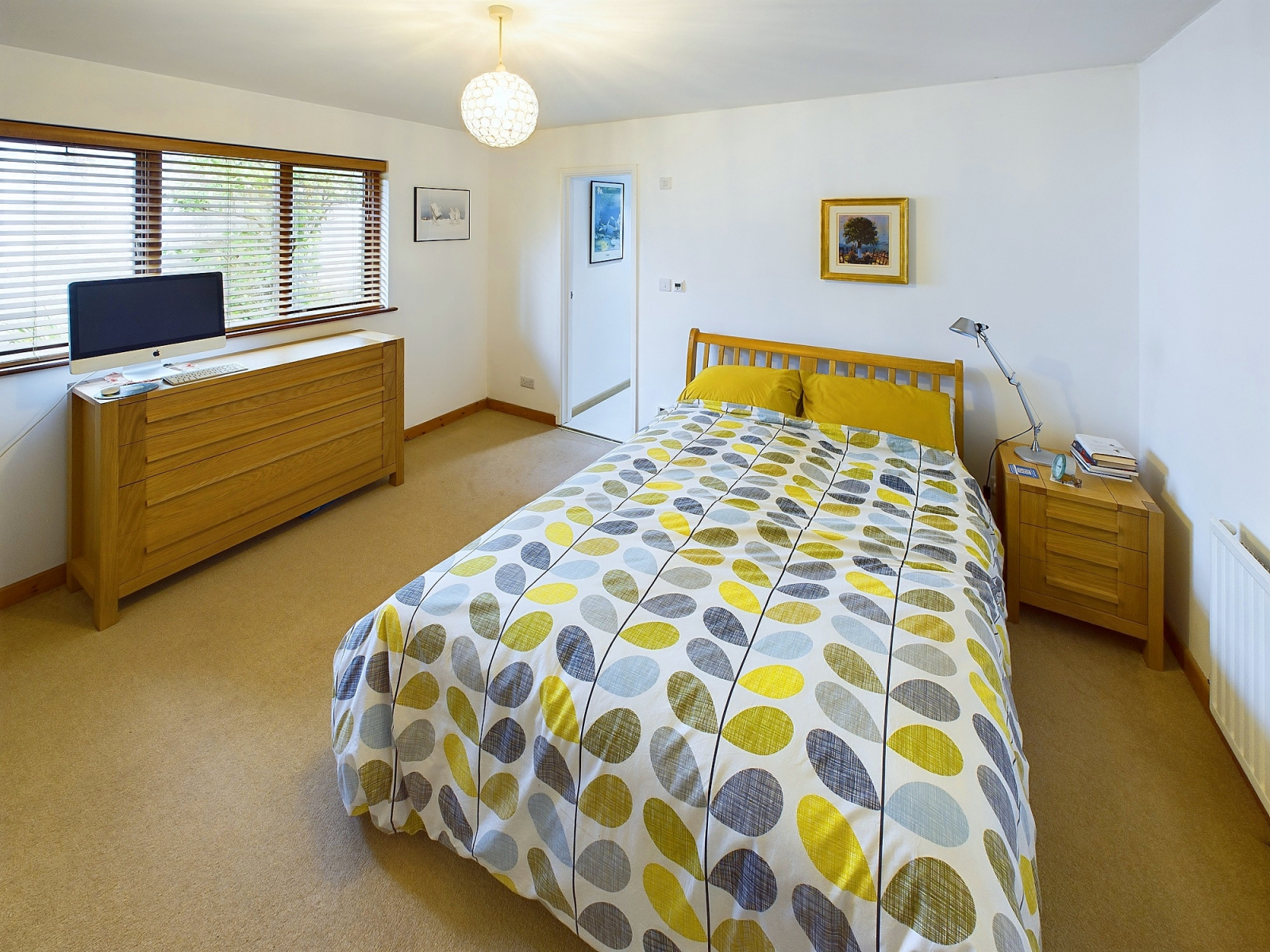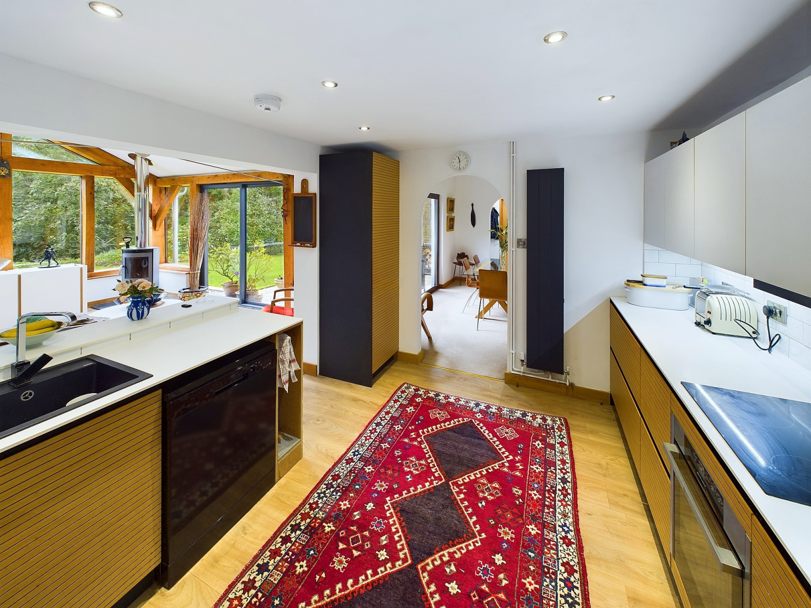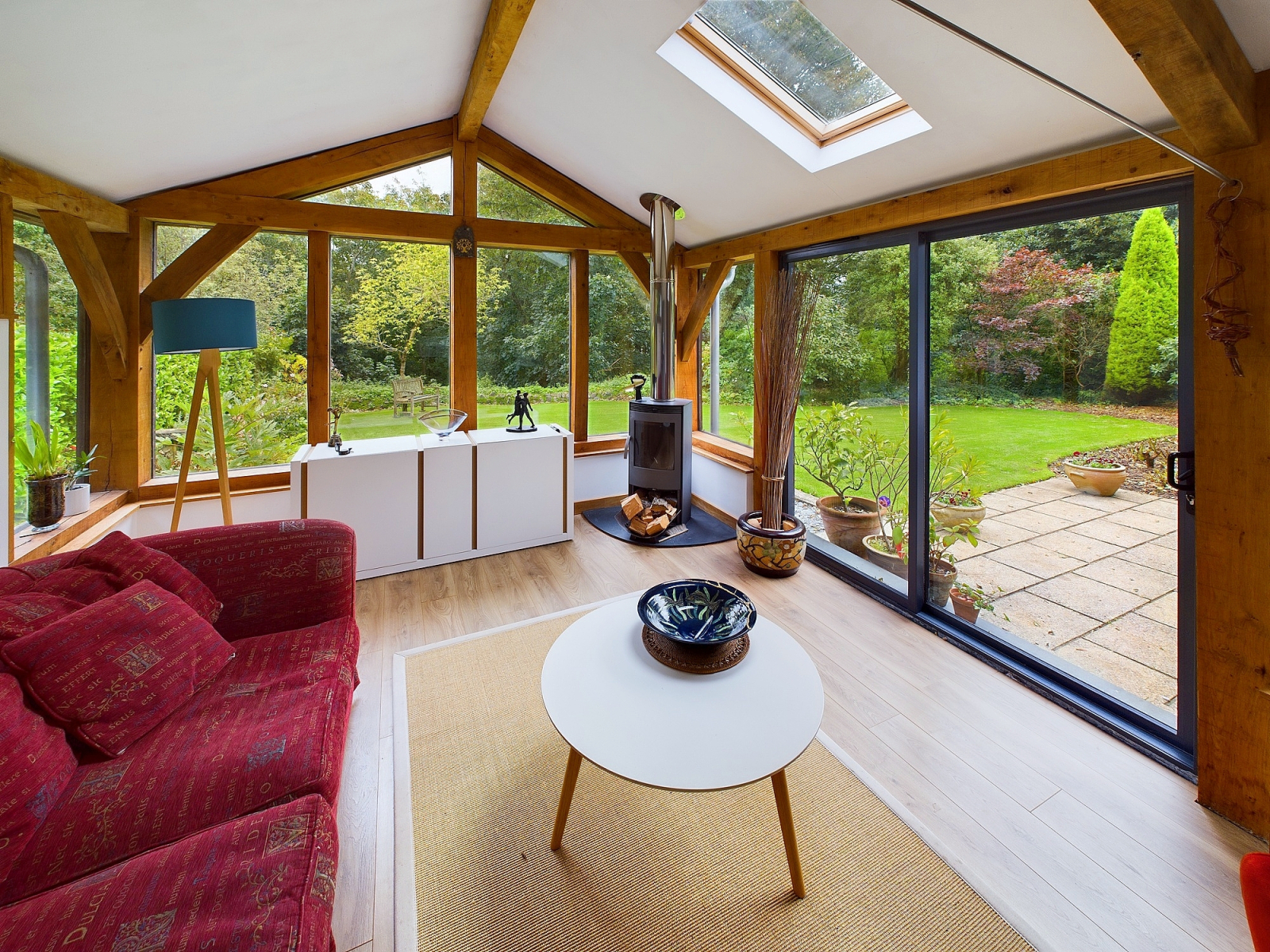 Constructed by Carpenter Oak, a beautiful room with wood burner on slate hearth, double glazed windows to the front and both sides, taking full advantage of superb views over the surrounding garden, patio doors to the garden, radiator, Velux, apex ceiling.