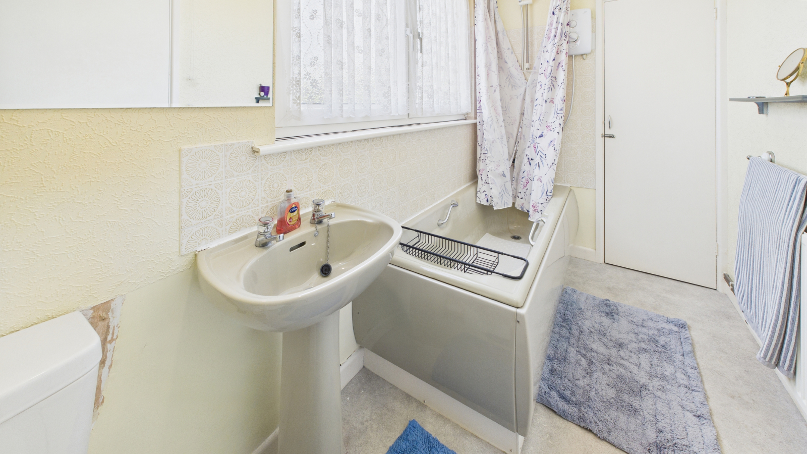 Double glazed window to rear, WC, pedestal wash hand basin, bath with electric shower over, radiator, cupboard housing hot water tank.