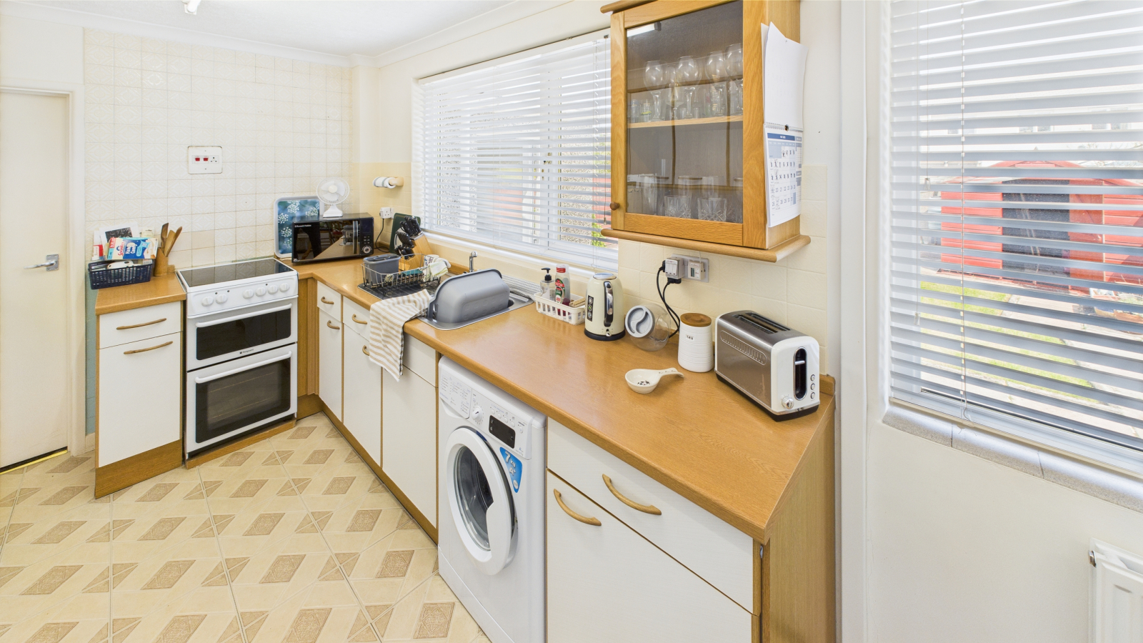 Radiator, two double glazed windows to rear, base and wall units with worksurfaces and tiling over, single drainer stainless steel sink unit, plumbing for washing machine, space for electric cooker, doors to: