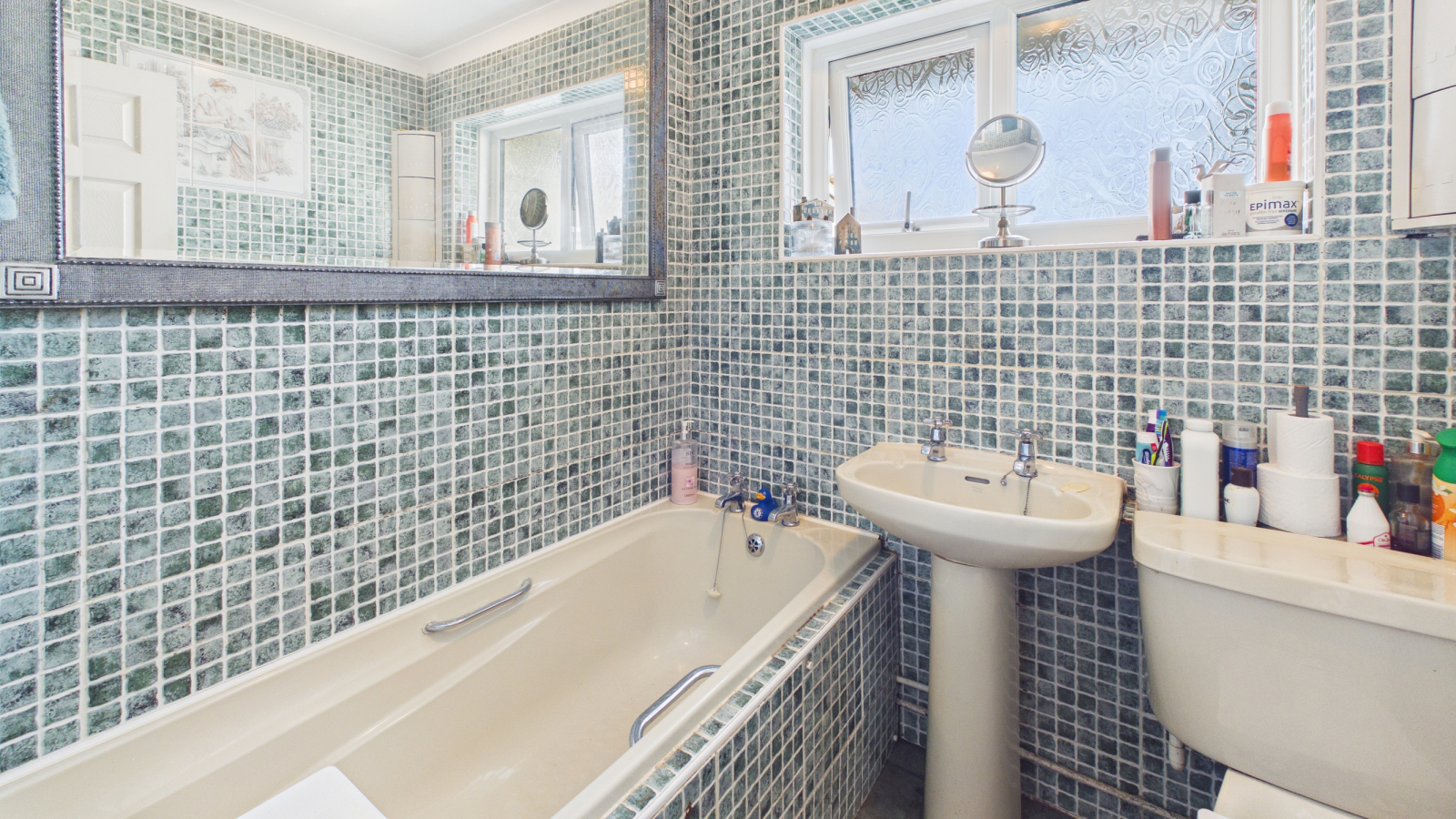 Double glazed window to front, wash hand basin, WC, bath, radiator, tiled floor and walls.