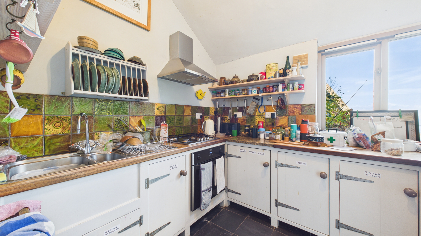 Slate floor, double glazed to two side enjoying views across Newlyn Harbour towards St Michael's Mount, fitted bookshelf, skylight, base units with worksurfaces and hand built Clive Bowen tiles over, built in oven, hob, extractor fan, one and half bowl stainless steel sink unit.