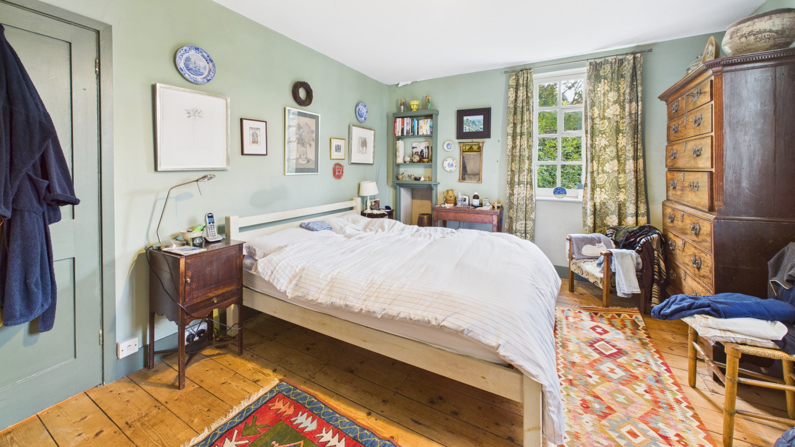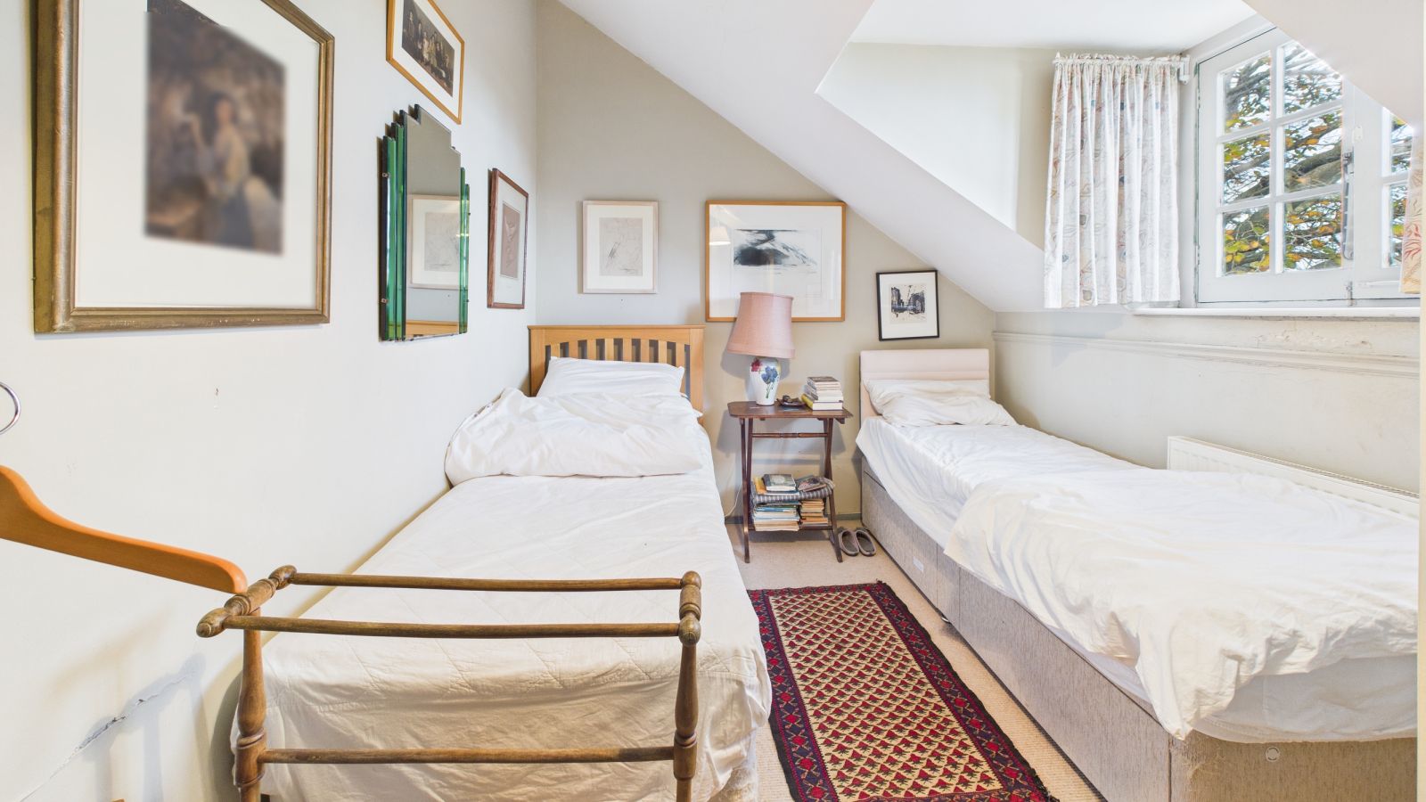 Dormer window with views, painted wooden floor, heated towel rail, bidet, WC, bath with shower over, pedestal wash hand basin, shelved cupboard.