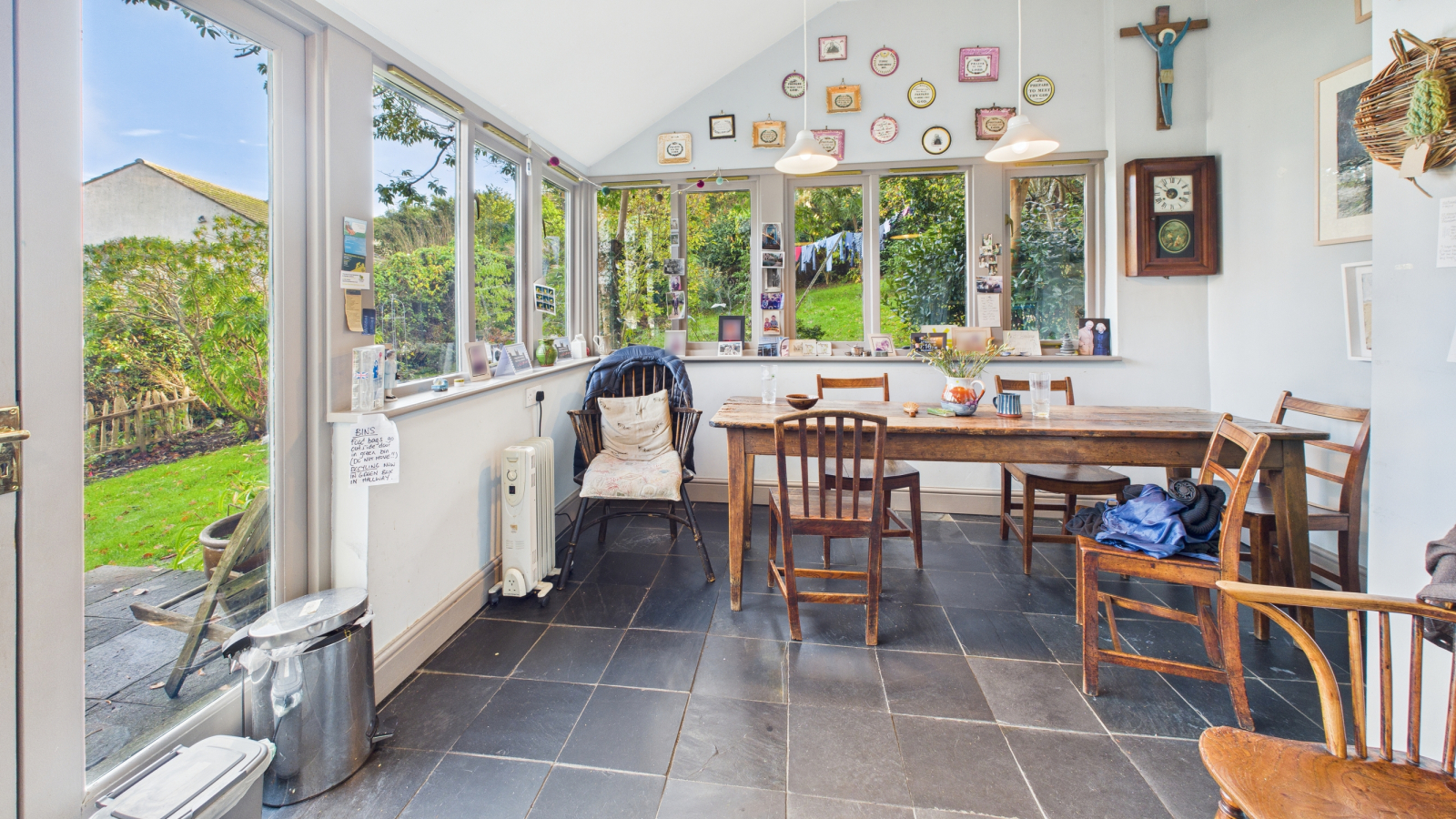 Four large single glazed multi pane casement picture windows to both the front and rear enjoying sea views, high ceiling, wood burner on granite hearth with rendered surround, four radiators.