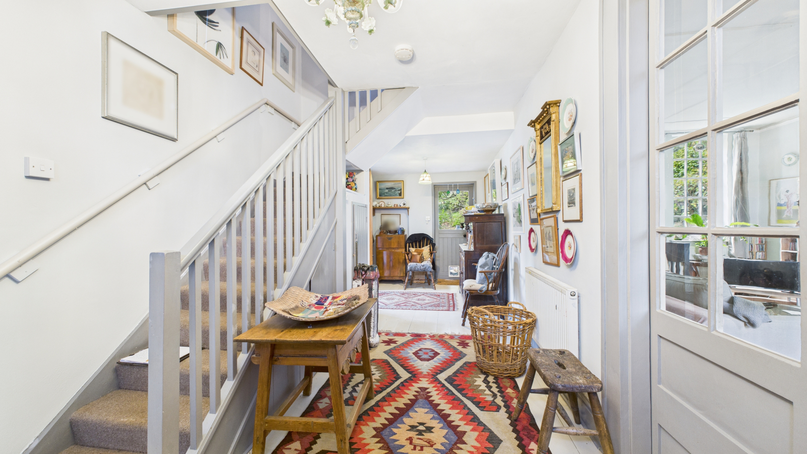 Painted wood floor, stairs rising with cupboards under, radiator, door to rear, double glass doors to: