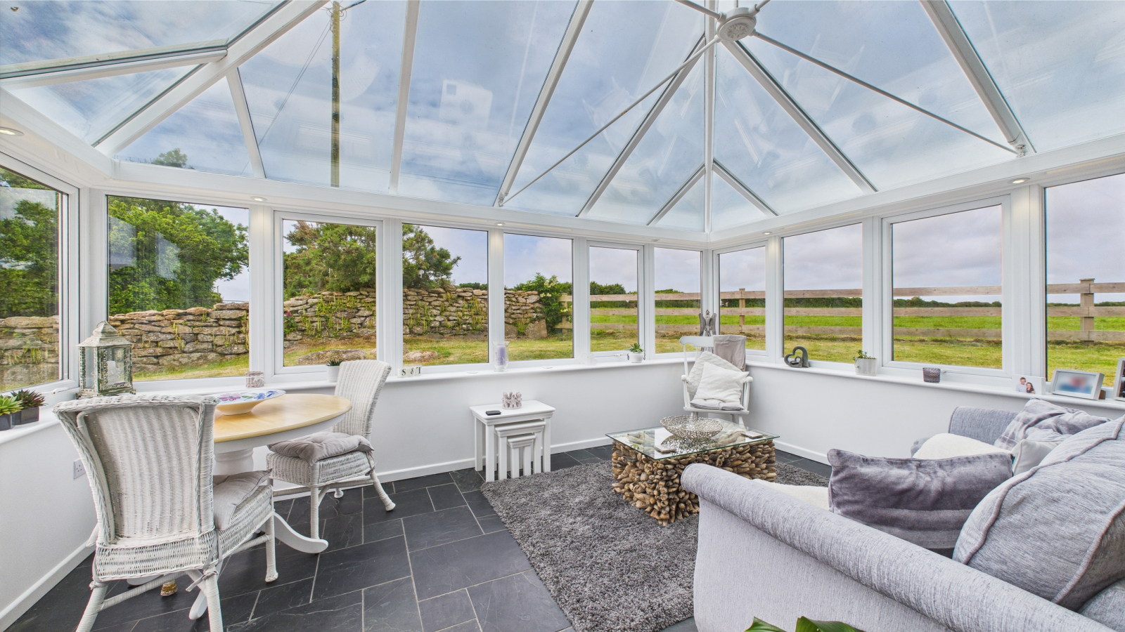 Slate floor, double glazed to three sides with vaulted glass roof, views across open fields, exposed granite wall, door to outisde.