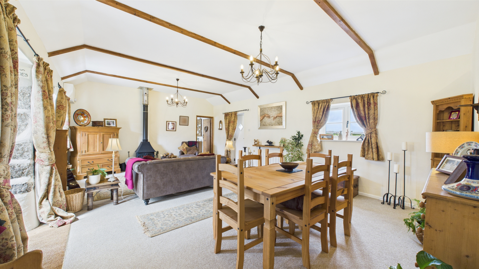 Two double glazed windows to front and rear, further door to rear garden, exposed granite around the windows, wood burner on slate hearth, electric heater, vaulted ceiling. Dining area opens into:
