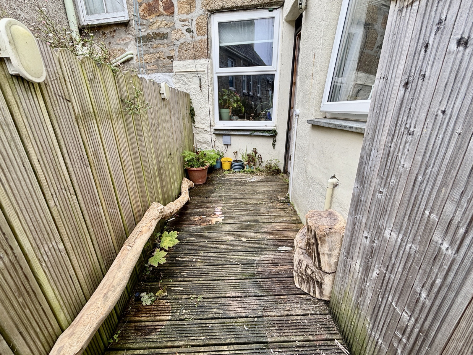 Small front garden with gate access and low level wall, rear courtyard, decked area with fencing and wall boundary, outside tap, external lighting, rear gate providing access onto St Henry Street.