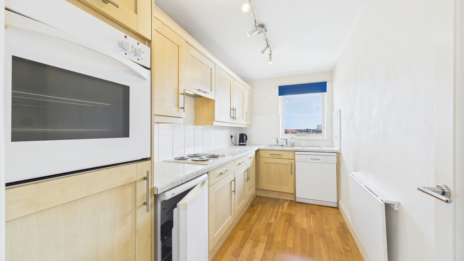 Engineered oak floor, double glazed window to front overlooking the inner harbour and the dock across the harbour to St Michael's Mount, well fitted with a range of floor and wall units, worktops with tiled splashback and inset Rolledge hob with extractor over, inset oven, space and plumbing for washing machine and fridge.
