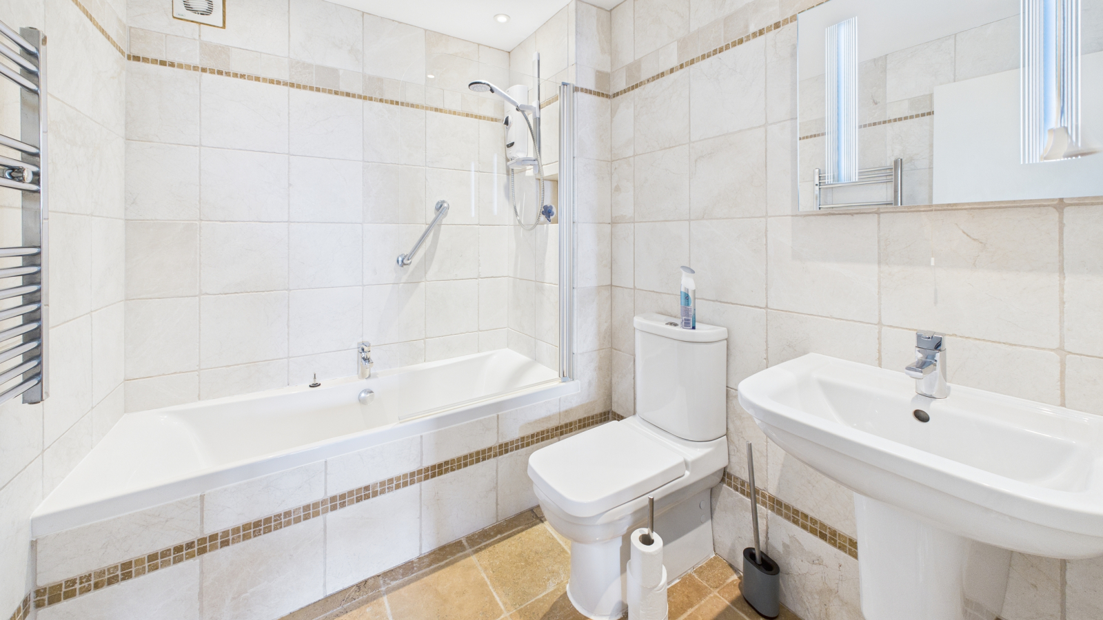 White three piece suite comprising panelled bath with Mira Shower over and glass screen, low level WC and wash hand basin, Travertine marble wall and floor tiles , fitted down light, extractor fan, chrome wall mounted ladder style heated towel rail.
