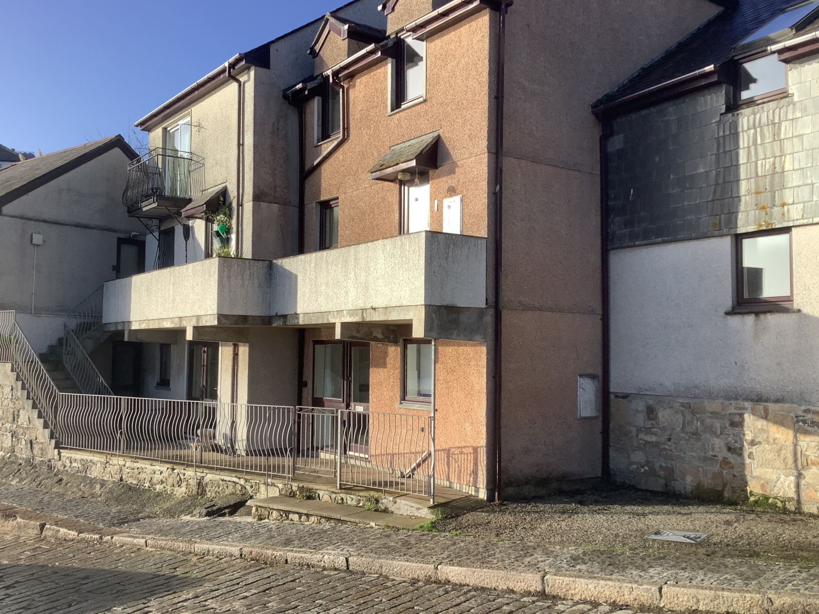 To the front of the property is a paved terrace and an enclosed courtyard. Terrace to the front is ideal for seating out and looking over the harbour to Mount's Bay in the distance. Allocated parking space garage.