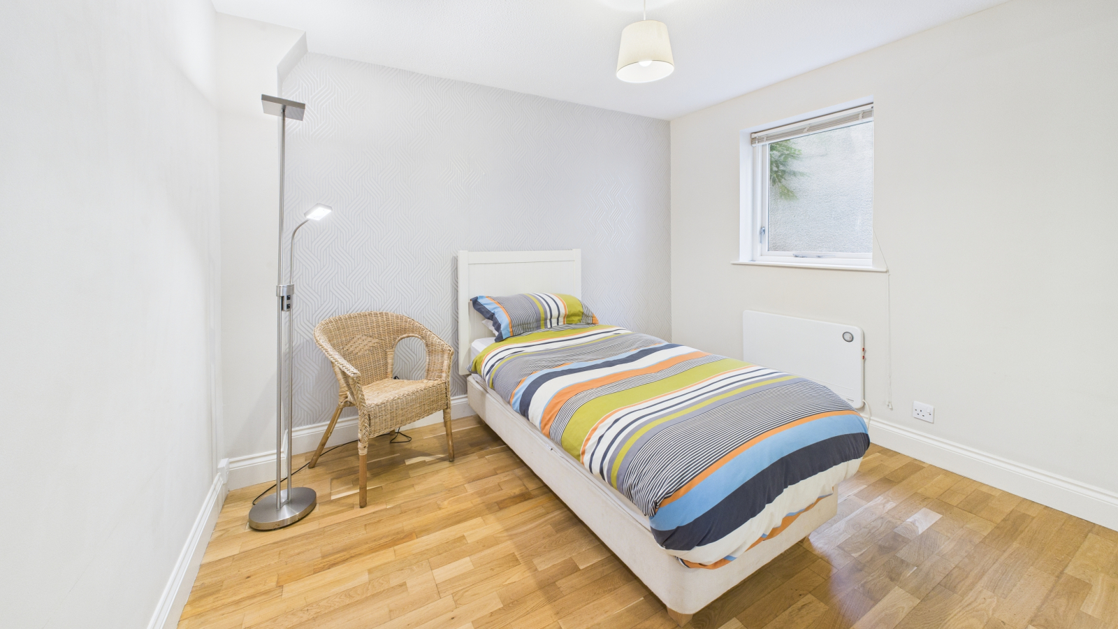 Engineered oak floor, double glazed window to rear courtyard with potential doorway, range of mirrored wardrobes to one wall with hanging rail and shelf, electric wall heater.