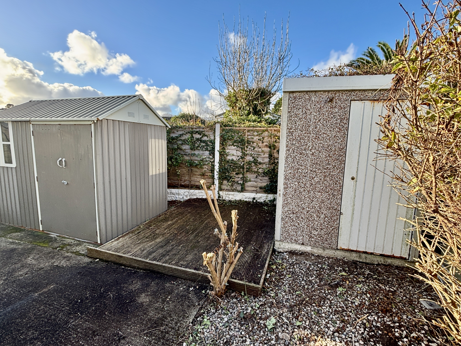 The property is approached with parking for one vehicle to one side and the garden is laid to gravel and decking, enclosed by wooden fence with two storage sheds.
