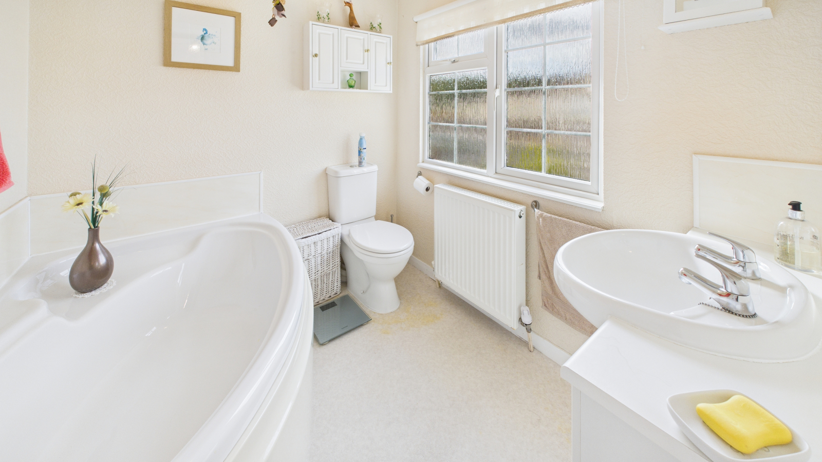 Double glazed window to front, radiator, WC, wash hand basin, corner bath, shaver point, extractor fan.