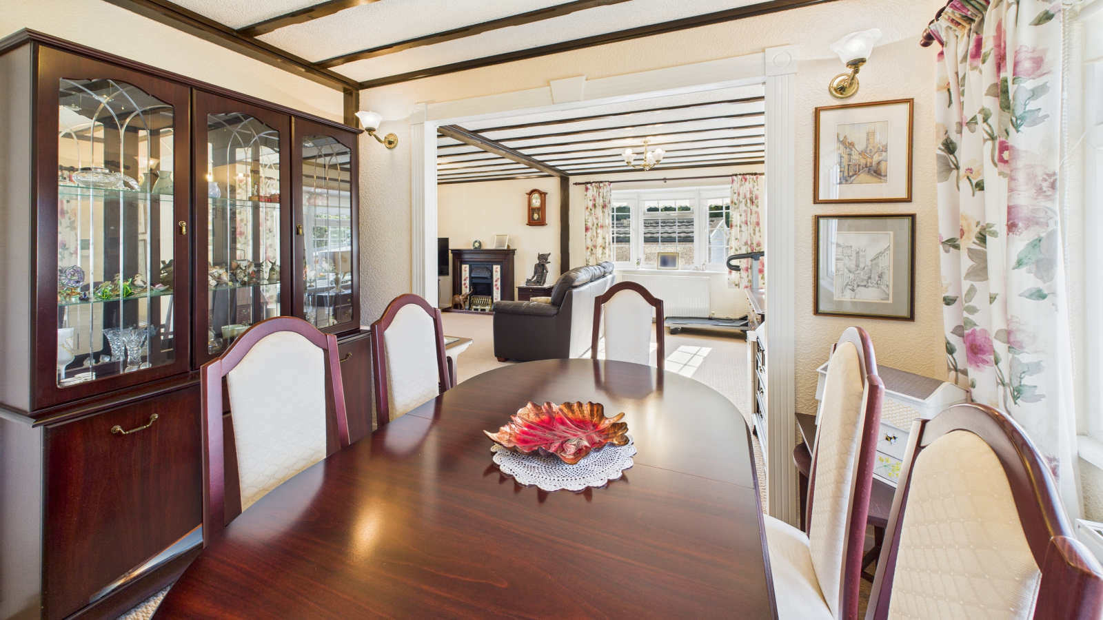 Dining room 9' 8" x 8' 2" (2.95m x 2.49m). Two bow windows to front, one to side and one to rear, three radiators, wall lights, electric fireplace to one wall with tiled surround, door from dining area to: