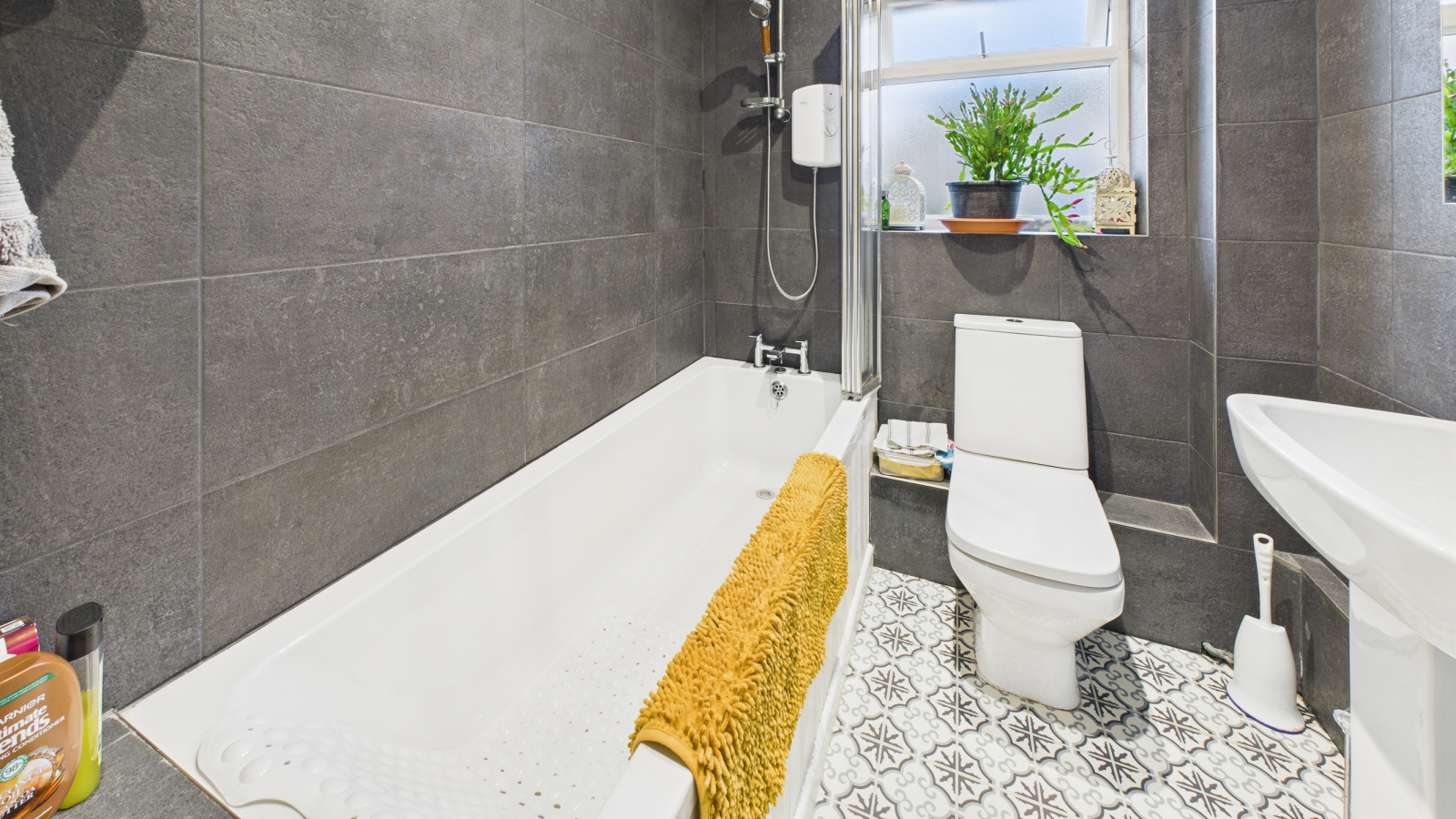 Double glazed window to rear, panelled bath with electric shower over, pedestal wash hand basin, WC, wall mounted electric fan heater, radiator.