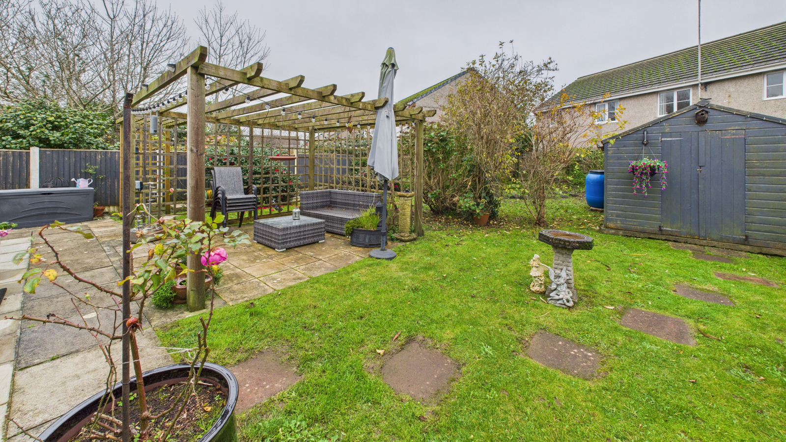 The property is approached over a garden laid to lawn with central pathway and patio to the front of the bungalow. Pathway to side leads to the rear garden, fully enclosed by wooden fencing, laid to lawn and areas of patio, one of which closed by pergola, wooden shed, outside power point, tap.