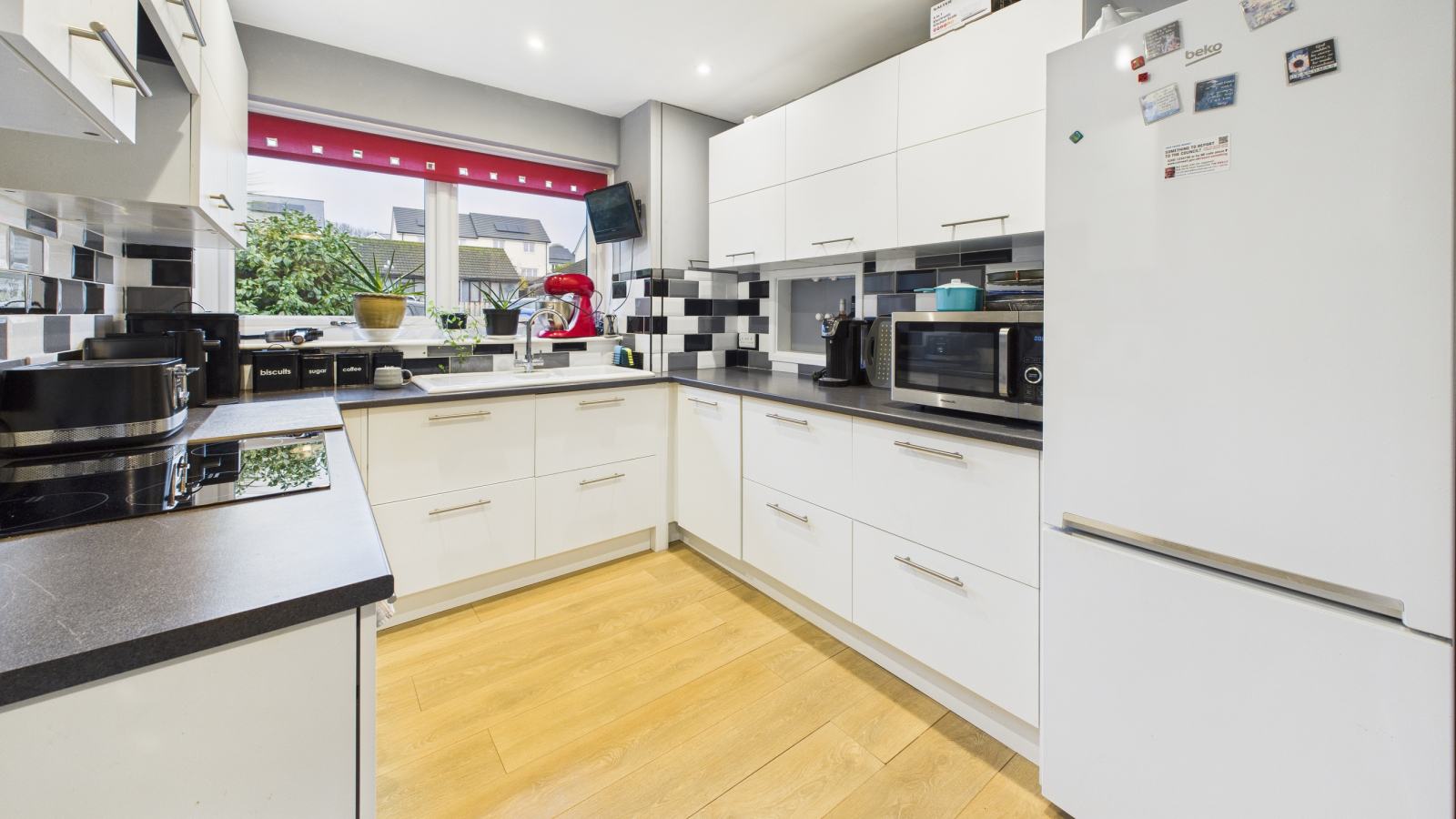Laminate wood floor, double glazed window to front, base and wall units with worksurfaces and tiling over, one and a half bowl ceramic sink, space for fridge/freezer, built in electric oven, induction hob and extractor over.