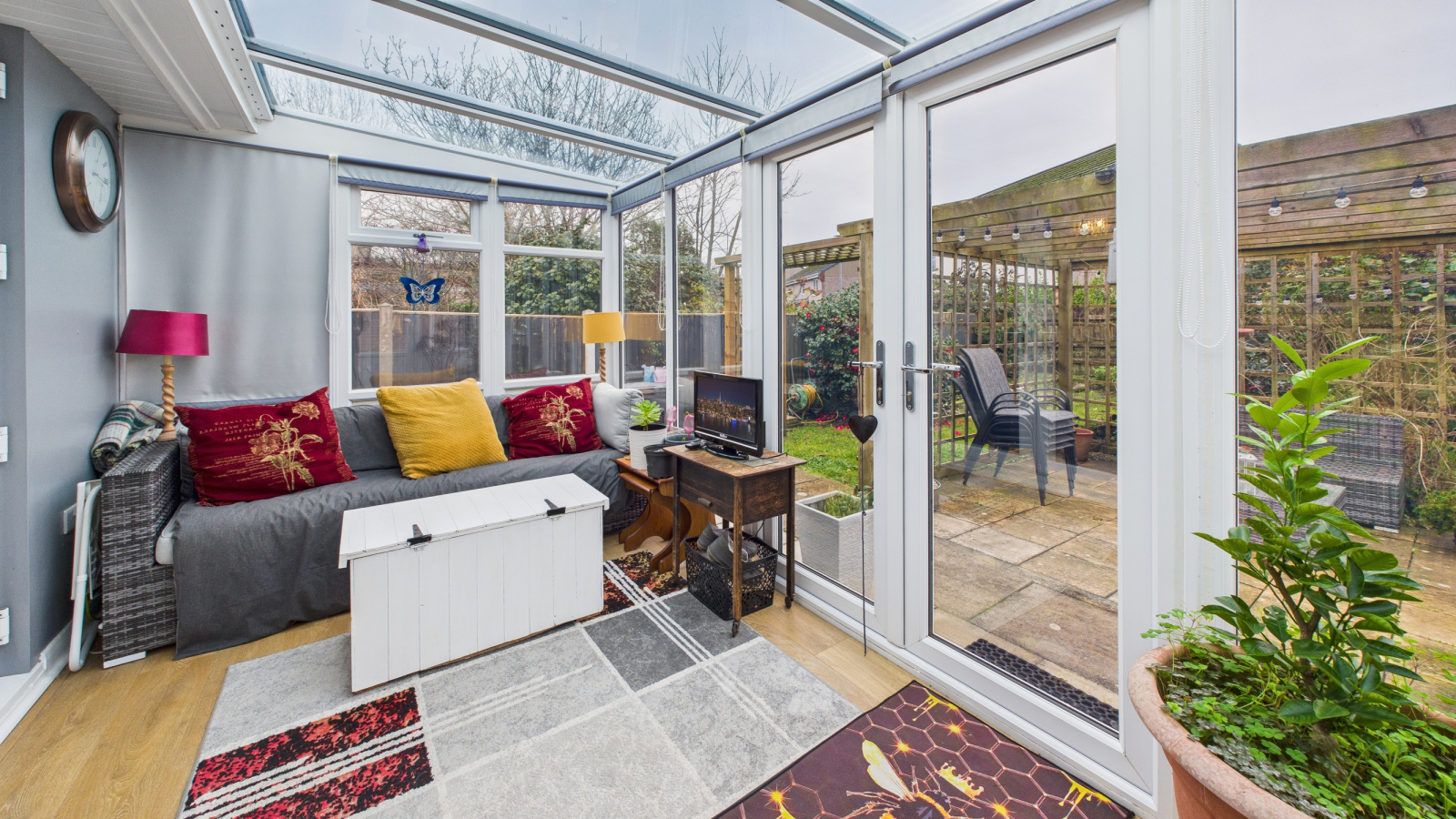 TV and telephone points, patios doors into sunroom, laminate wood floor.