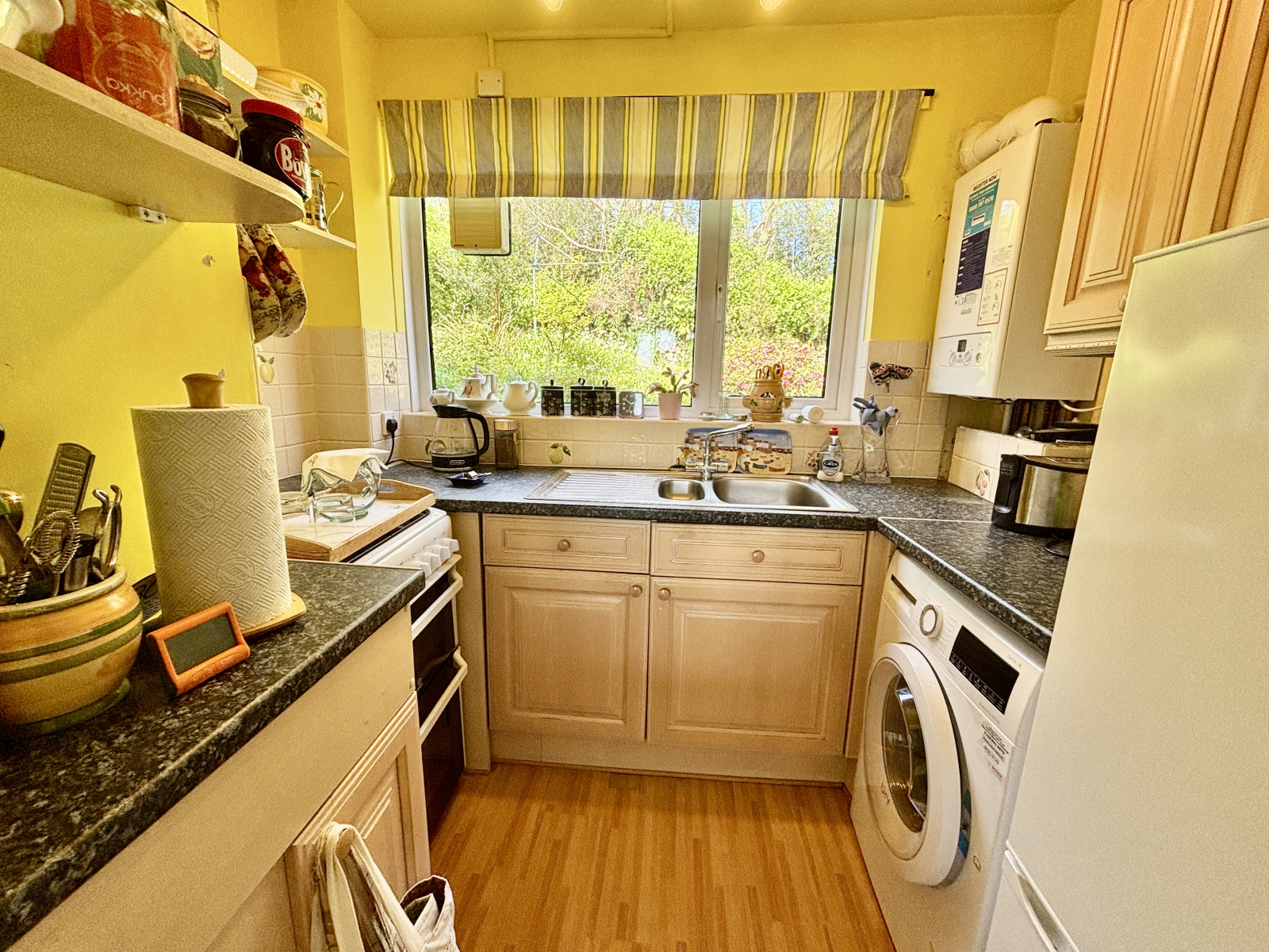 Double glazed window to rear, one and a half bowl stainless steel sink unit, base and wall units with worksurfaces and tiling over, gas cooker point, plumbing for washing machine, space for fridge, wall mounted gas combination boiler.