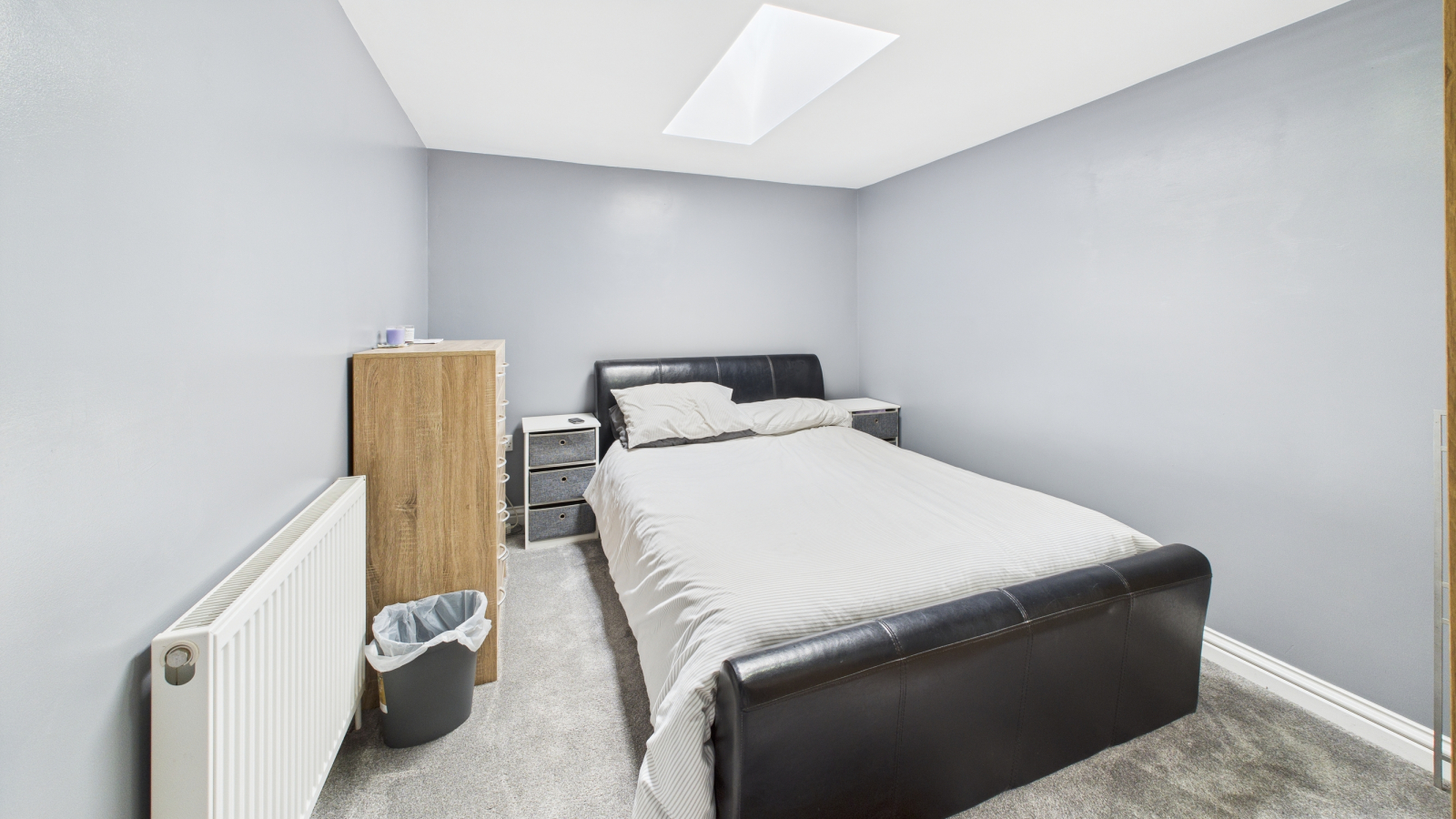 Radiator, sash window to rear with sea glimpses and views over Newlyn village, skylight.