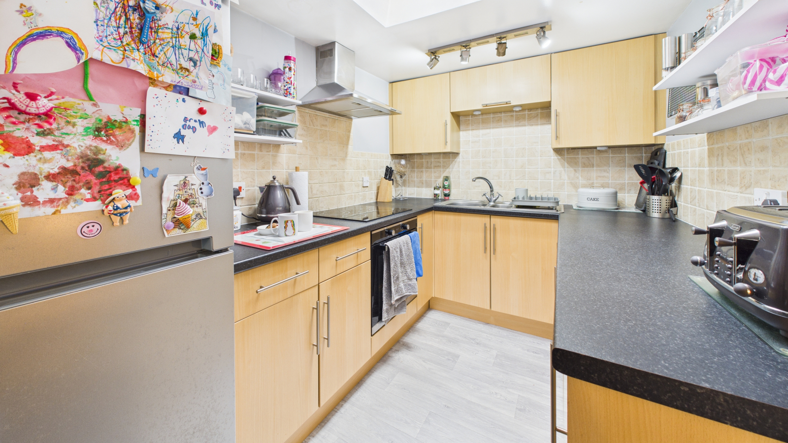 Base and wall units, worksurfaces and tiling over, single drainer stainless steel sink, skylight, electric oven, hob, extraction unit.
