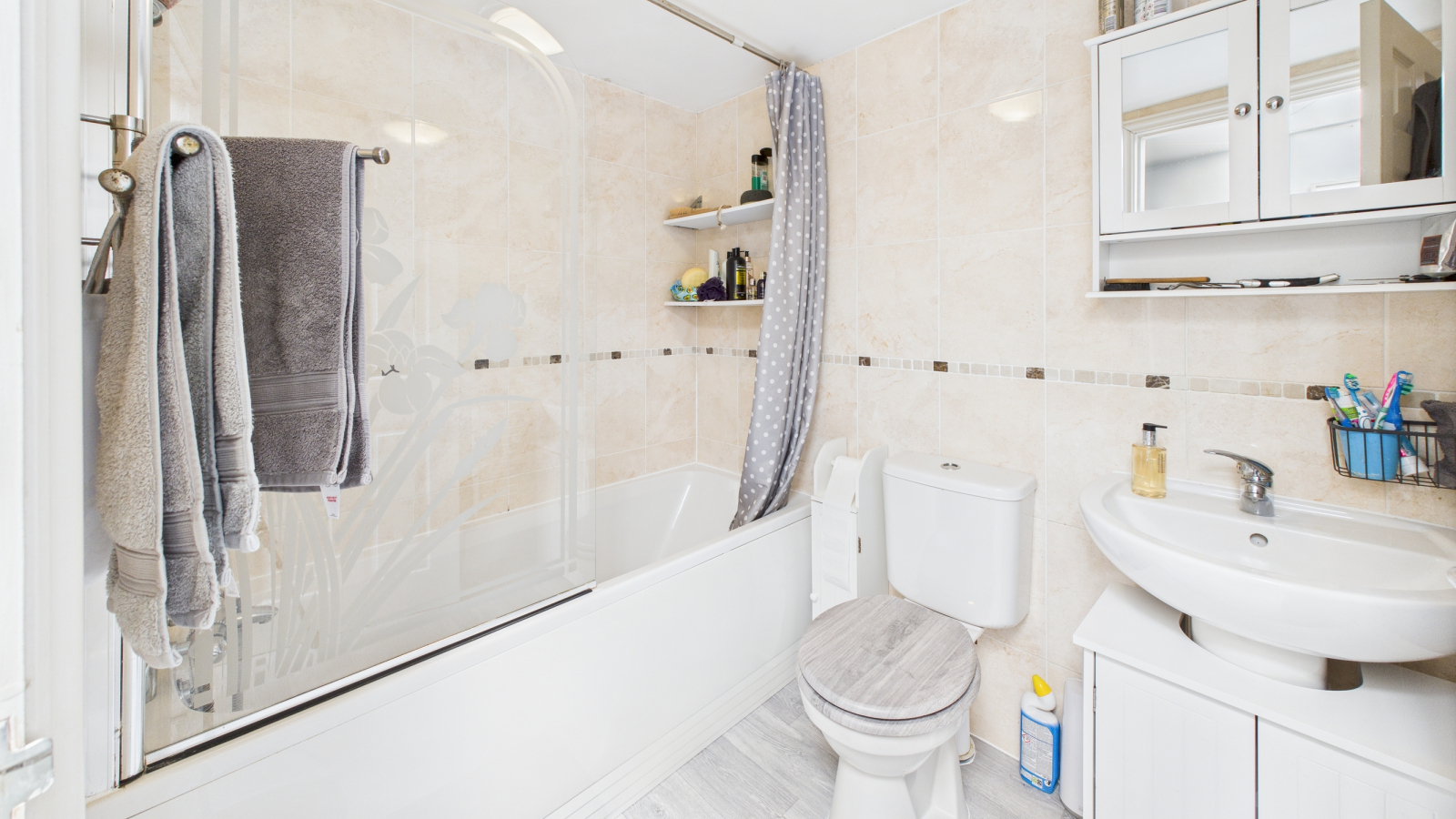 Fully tiled walls, bath with mains shower, WC, pedestal wash hand basin, extractor fan, heated towel rail.