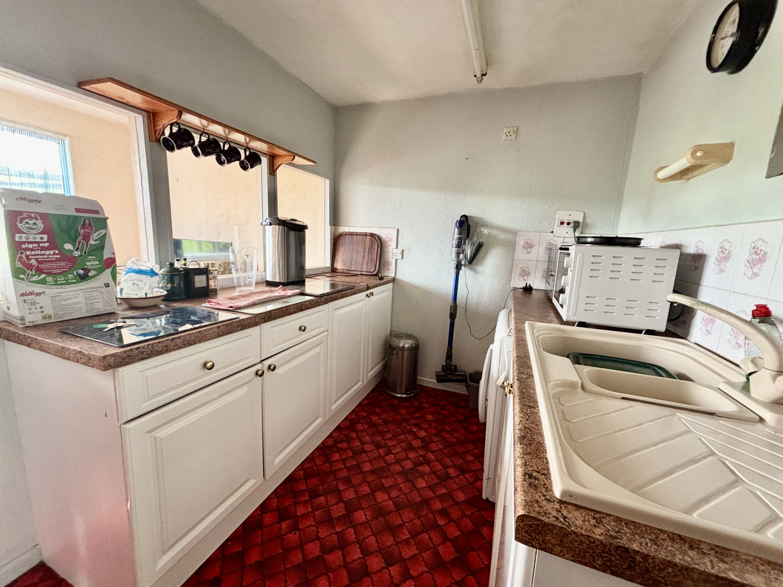 Base units with worksurfaces over, 1 1/2 bowl sink unit, plumbing for washing machine, hot water heater, glazed window overlooking lounge.