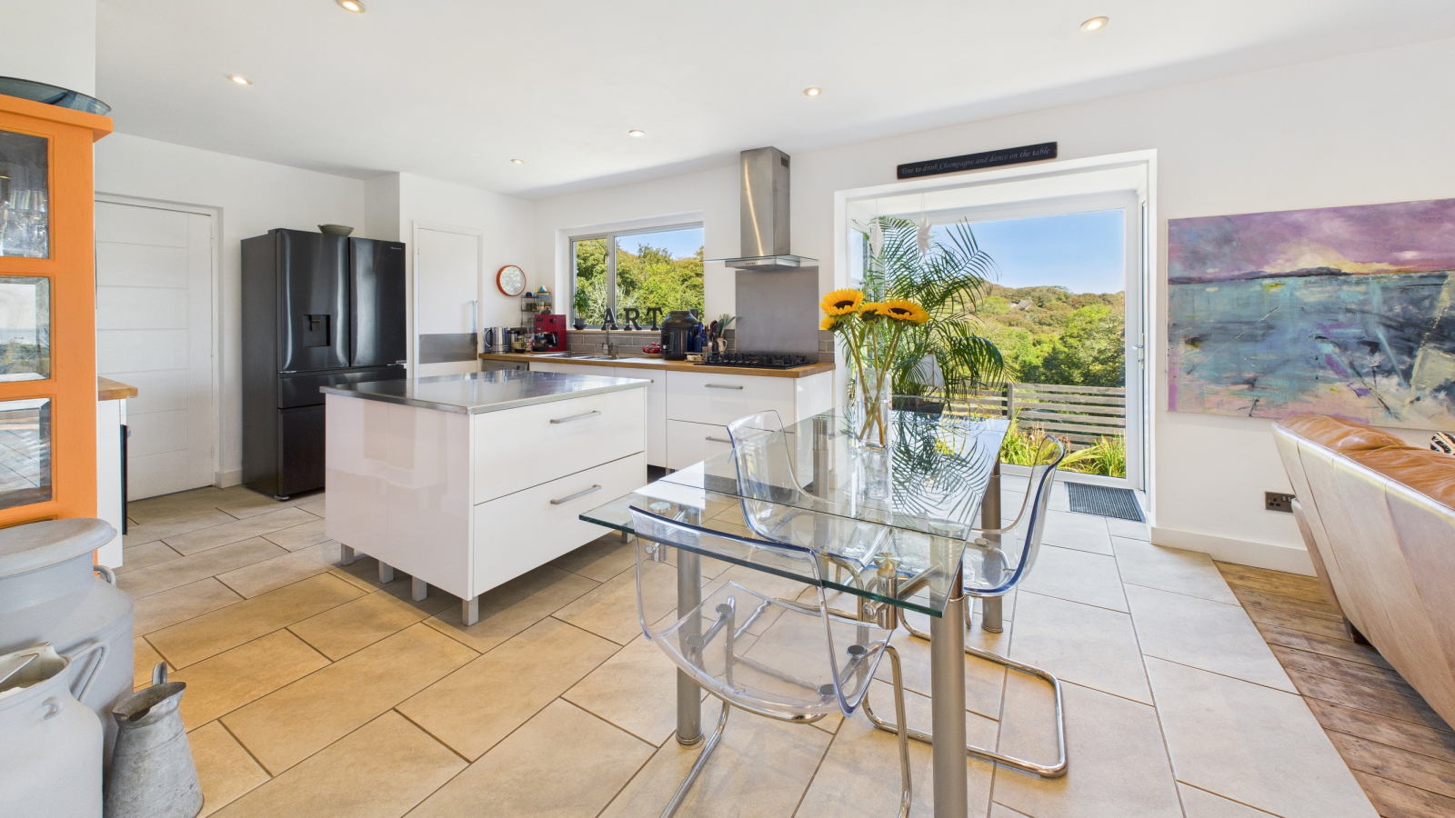 Inset spotlights, tiled floor, double glazed window to rear, full height picture bay window to rear with valley views and door onto rear sun terrace, white gloss kitchen base units with wooden worksurfaces and tiling over, central island with stainless steel worksurfaces, five ring gas hob, extractor fan over, electric oven, plumbing for dishwasher, space for american style fridge/freezer, shelved pantry with window to rear